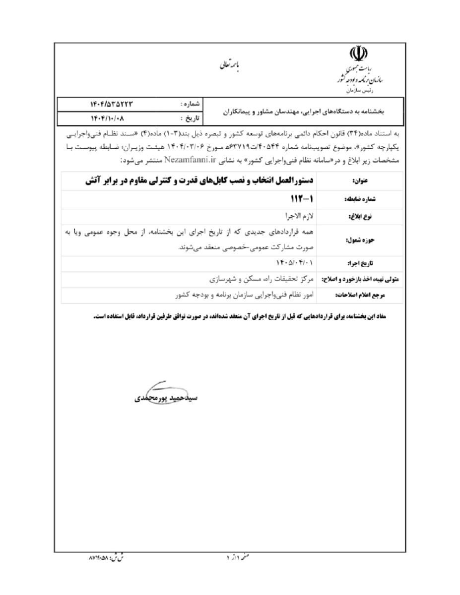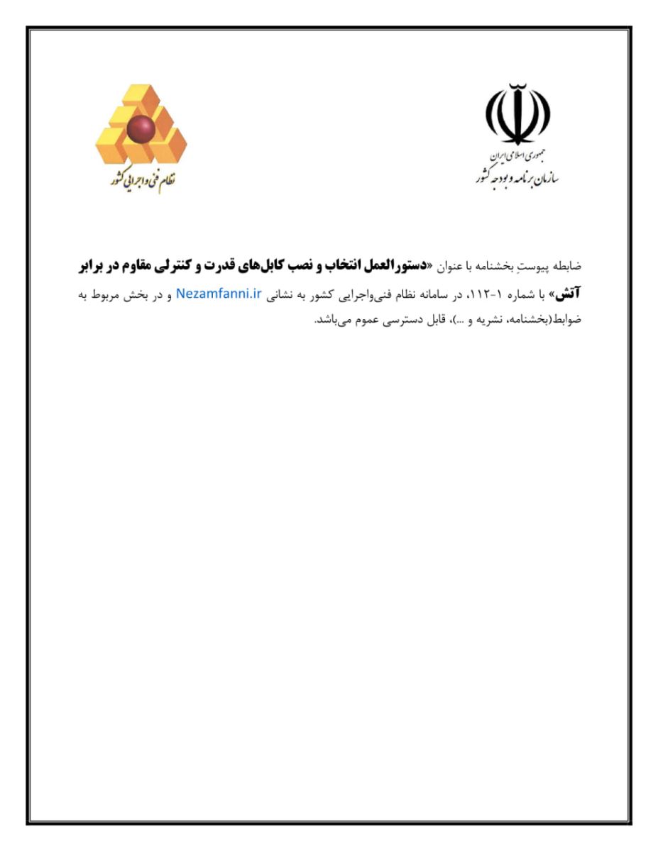 ⬅️ضابطه پیوست بخشنامه به عنوان "دستورالعمل انتخاب و نصب کابل های قدرت و کنترلی مقاوم در برابر آتش" با شماره ۱_۱۱۲ در سامانه نظام فنی و اجرایی کشور به نشانی www.Nezamfanni.ir و در بخش مربوط به ضوابط (بخشنامه، نشریه و ...)قابل دسترسی عموم میباشد.