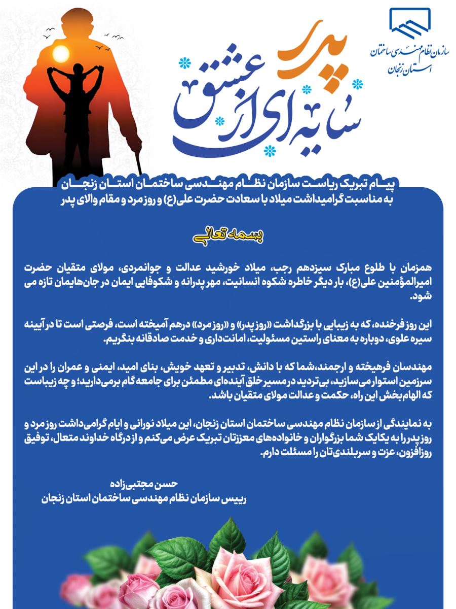 پیام تبریک مهندس حسن مجتبی زاده، ریاست سازمان نظام مهندسی ساختمان استان زنجان،