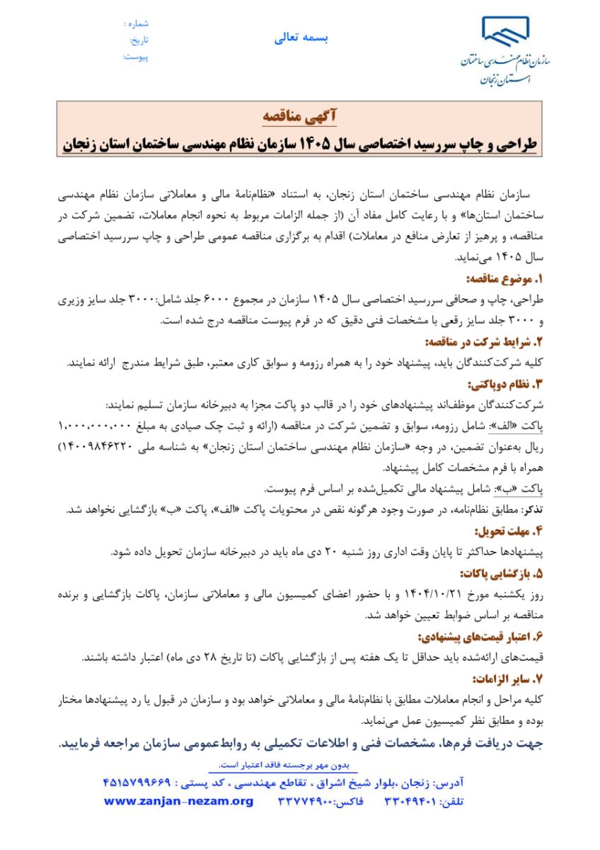 ☀️سازمان نظام مهندسی ساختمان استان زنجان، به استناد «نظام‌نامۀ مالی و معاملاتی سازمان نظام مهندسی ساختمان استان‌ها» و با رعایت کامل مفاد آن (از جمله الزامات مربوط به نحوه انجام معاملات، تضمین شرکت در مناقصه، و پرهیز از تعارض منافع در معاملات) اقدام به برگزاری مناقصه عمومی طراحی و چاپ سررسید اختصاصی سال ۱۴۰۵ می‌نماید.