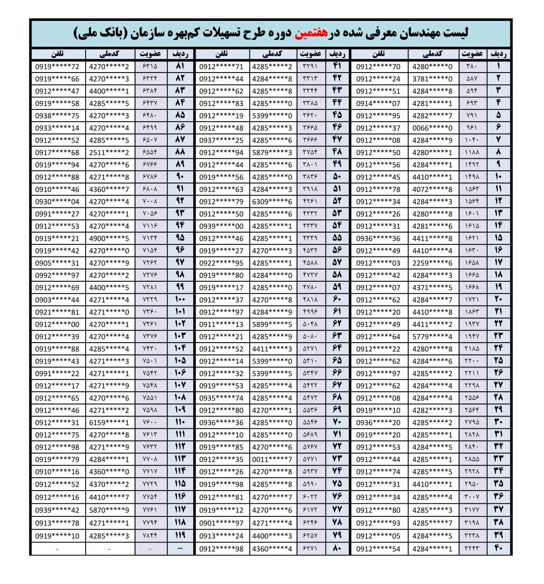 لیست مهندسان معرفی شده در هفتمین دوره طرح طرح تسهیلات کمبهره سازمان نظام مهندسی ساختمان زنجان به بانک ملی