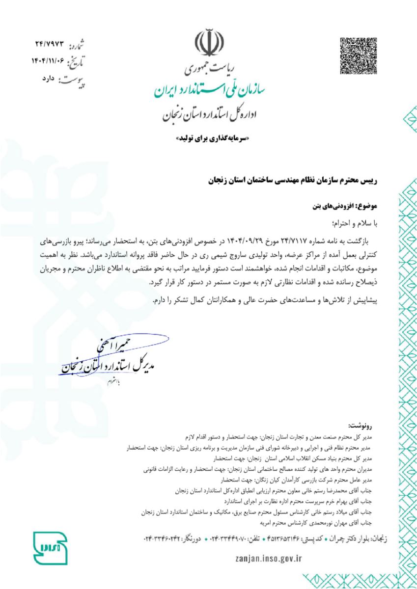 🛡 فقدان پروانه کاربرد علامت استاندارد فرآورده افزودنی بتن - واحد تولیدی ساروج شیمی ری