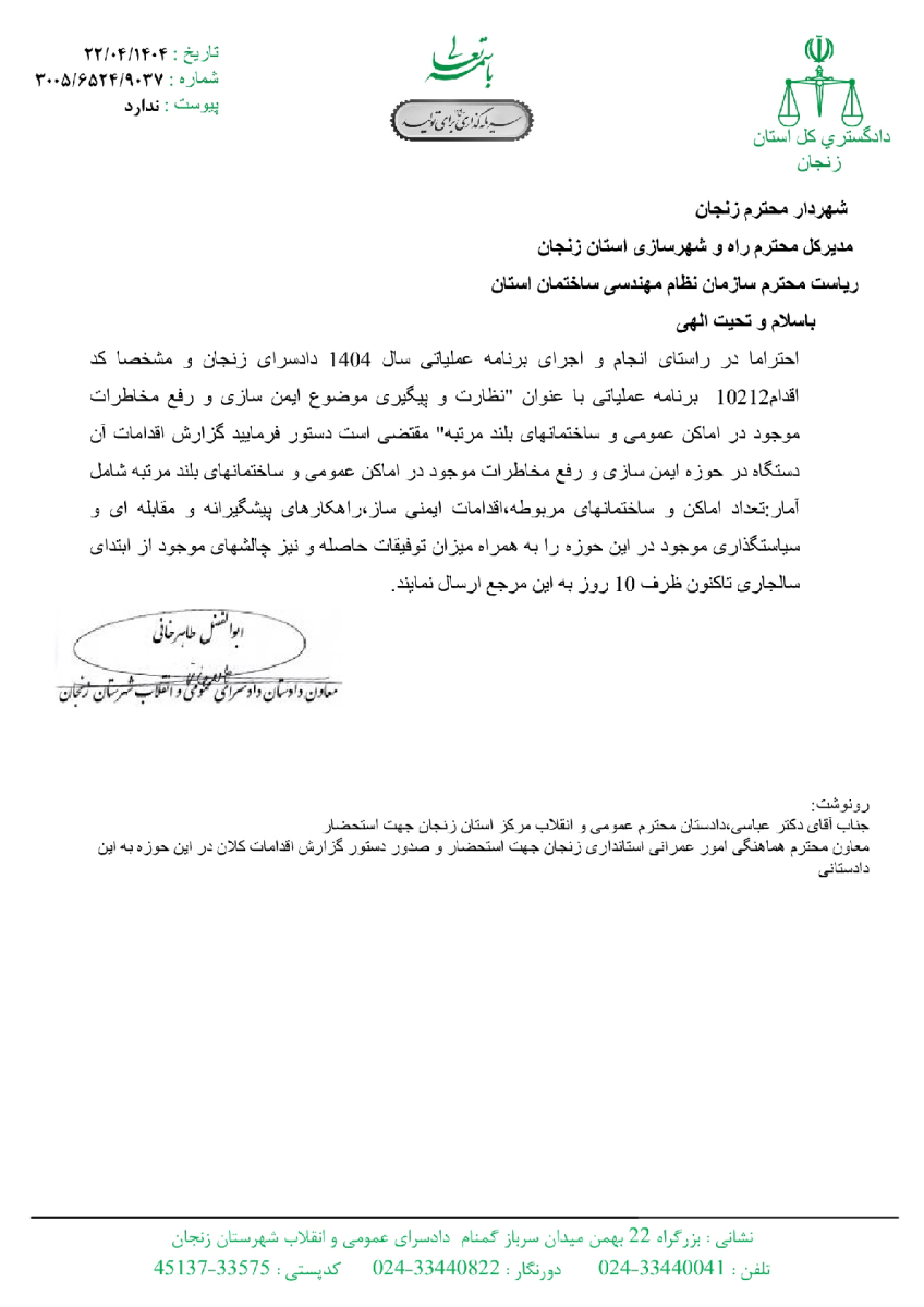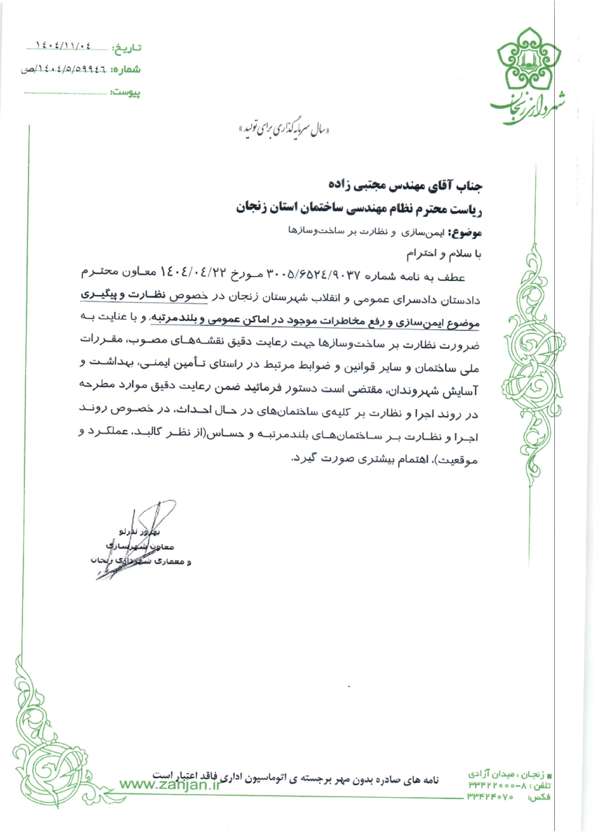 ☀️پیرو مکاتبه دادستان دادسرای عمومی و انقلاب شهرستان زنجان در خصوص نظارت و پیگیری موضوع ایمن سازی و رفع مخاطرات موجود در اماکن عمومی و بلند مرتبه و با عنایت به ضرورت نظارت بر ساخت و سازها جهت رعایت دقیق نقشههای مصوب، مقررات ملی ساختمان و سایر قوانین و ضوابط مرتبط در راستای تامین ایمنی، بهداشت و آسایش شهروندان، مقتضی است ضمن رعایت دقیق موارد مطروحه در روند اجرا و نظارت بر ساختمانهای بلند مرتبه و حساس (از نظر کالبد، عملکرد و موقعیت) اهتمام بیشتری صورت پذیرد.