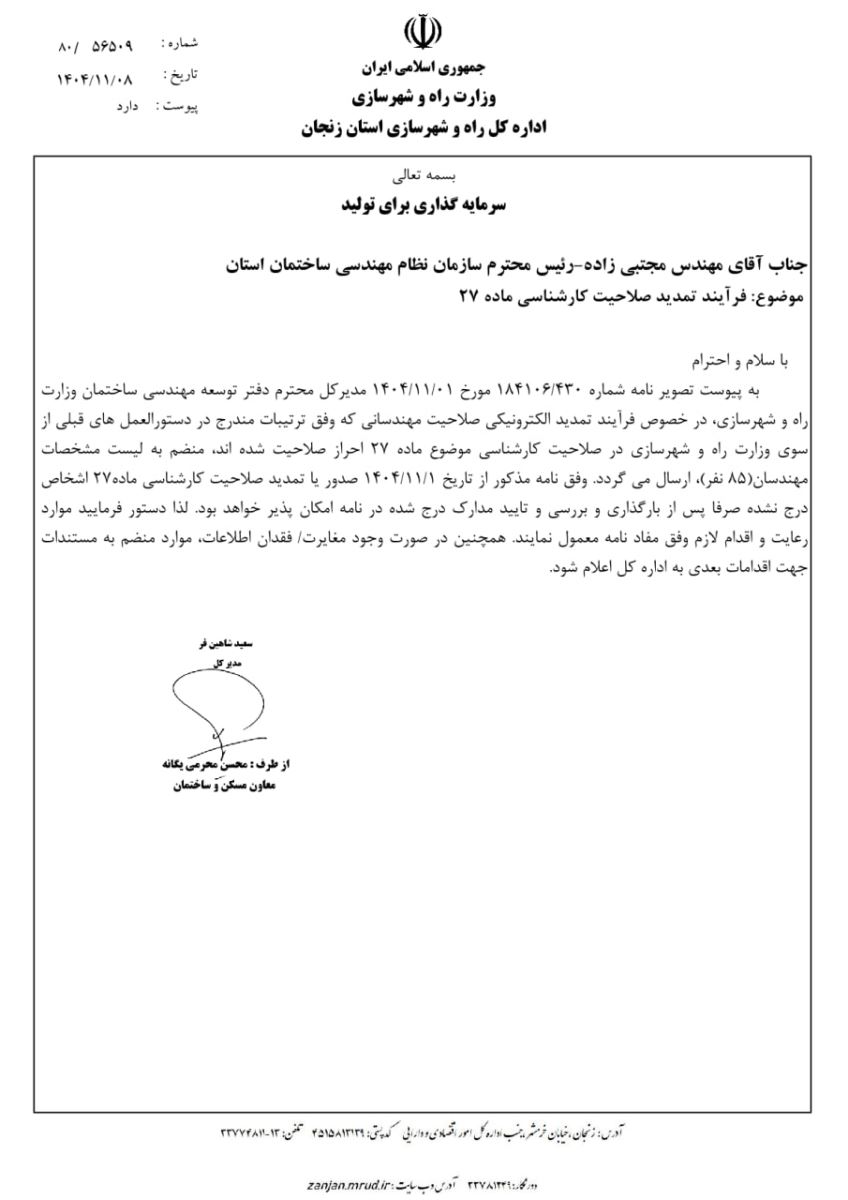 💢پیرو مکاتبه دفتر توسعه مهندسی ساختمان وزارت راه و شهرسازی در خصوص فرایند تمدید الکترونیکی صلاحیت مهندسانی که وفق ترتیبات مندرج در دستورالعملها در صلاحیت کارشناسی ماده ۲۷ احراز صلاحیت شدهاند، از ابتدای بهمن ماه سال جاری صدور یا تمدید صلاحیت کارشناسی ماده ۲۷ اشخاص صرفاً پس از بارگذاری و بررسی و تایید مدارک لازم مکانپذیر خواهد بود.