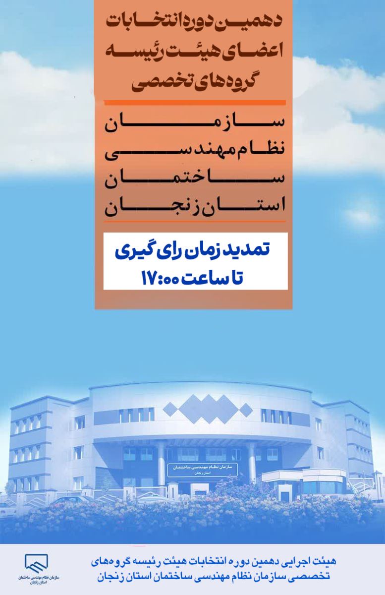 🔸️بر این اساس آخرین مهلت ثبت رای و مشارکت در دهمین دوره انتخابات هیئت رئیسه گروههای تخصصی سازمان نظام مهندسی ساختمان استان زنجان، ساعت ۱۷:۰۰ روز جاری خواهد بود.