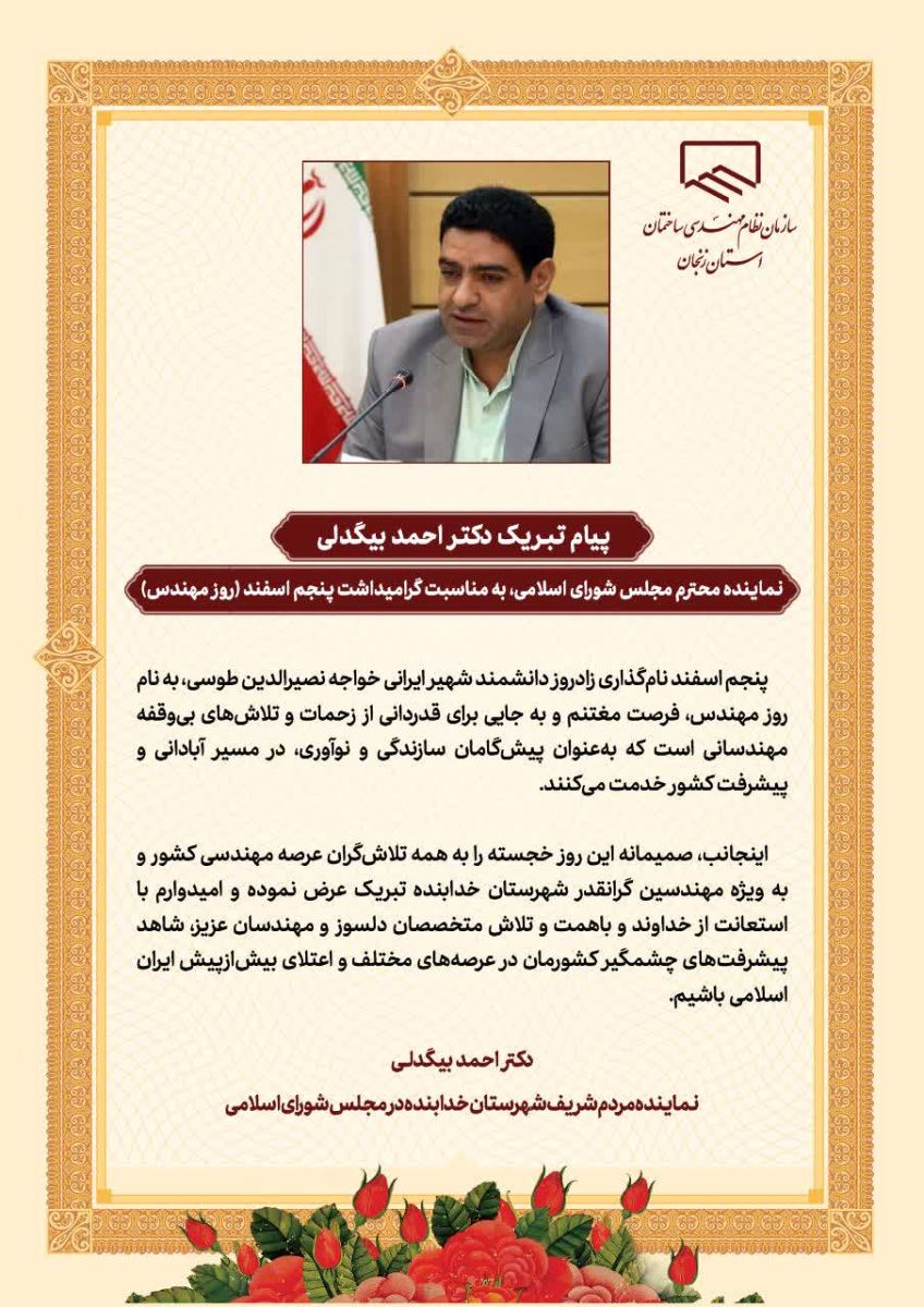 پیام تبریک دکتر احمد بیگدلی؛ نماینده محترم مردم شریف شهرستان خدابنده در مجلس شورای اسلامی، به مناسبت پنجم اسفند، روز مهندس