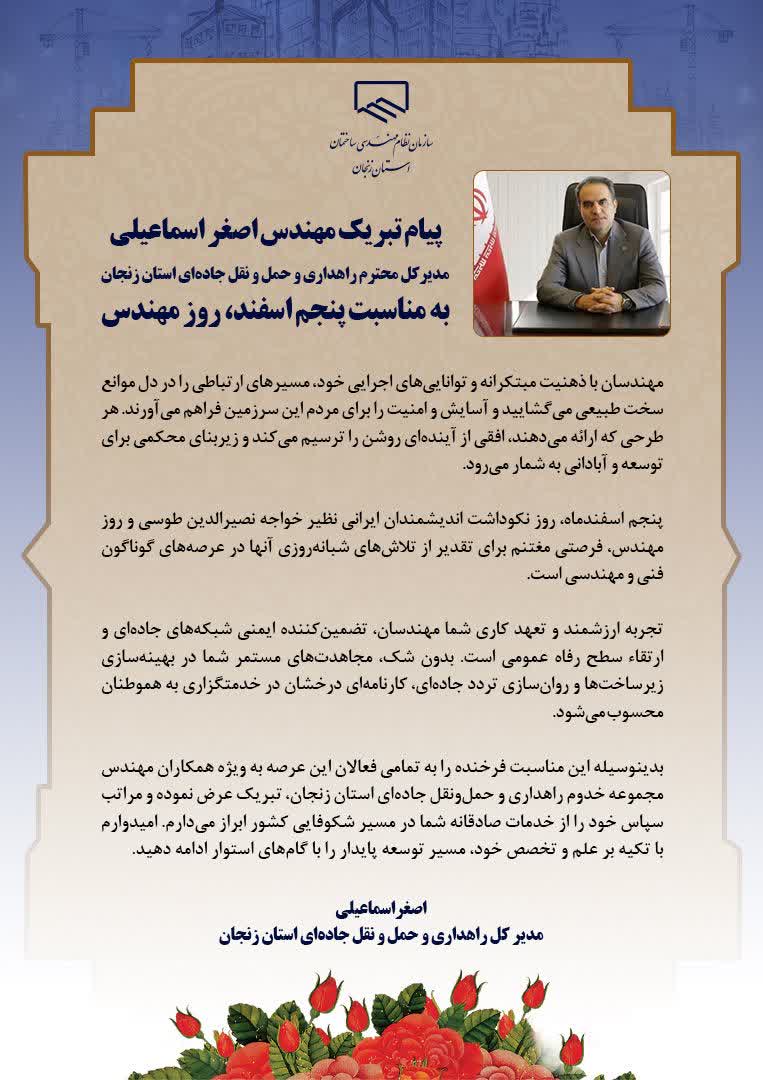 پیام تبریک مهندس اصغر اسماعیلی، مدیر کل محترم اداره راهداری و حمل و نقل جاده‌ای استان زنجان، به مناسبت پنجم اسفند، روز مهندس