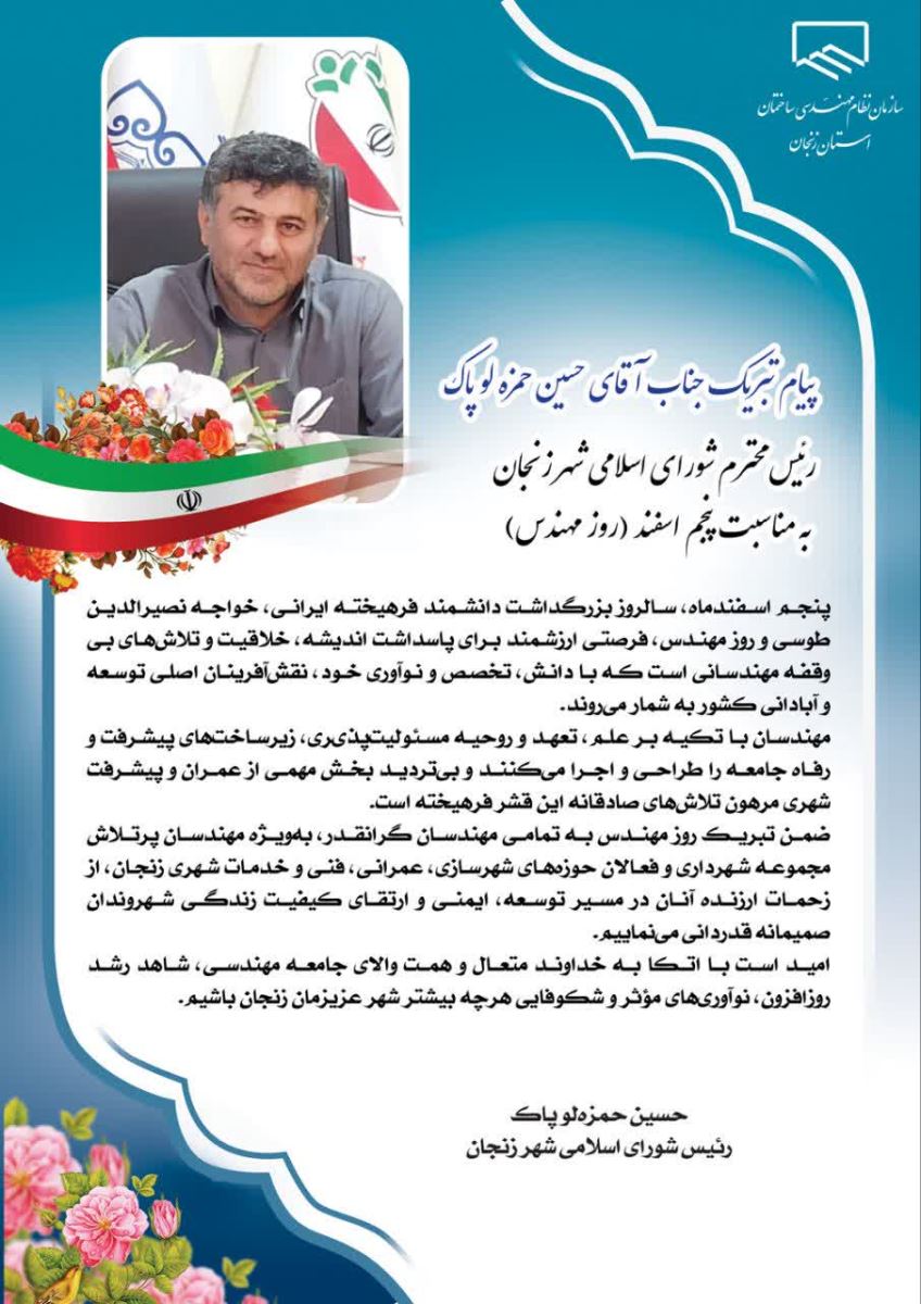 پیام تبریک آقای حسین حمزهلو پاک، ریاست محترم شورای اسلامی شهر زنجان، به مناسبت پنجم اسفند، روز مهندس