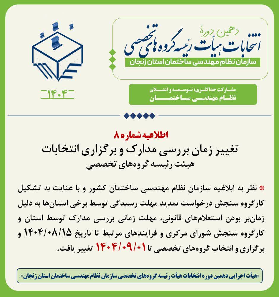 🔹️ به اطلاع داوطلبان محترم دهمین دوره انتخابات هیئت رئیسه گروههای تخصصی سازمان نظام مهندسی ساختمان استان زنجان میرساند با عنایت به ابلاغیه سازمان نظام مهندسی ساختمان کشور با مضمون اعلام جدول زمانی برگزاری انتخابات، مهلت زمانی ثبت نام از داوطلبان خواهان شرکت در انتخابات موصوف، تا پایان وقت اداری روز شنبه پنجم مهر ماه سال جاری، با استمرار کلیه ترتیبات و تشریفات قانونی مربوطه تمدید گردیده است.