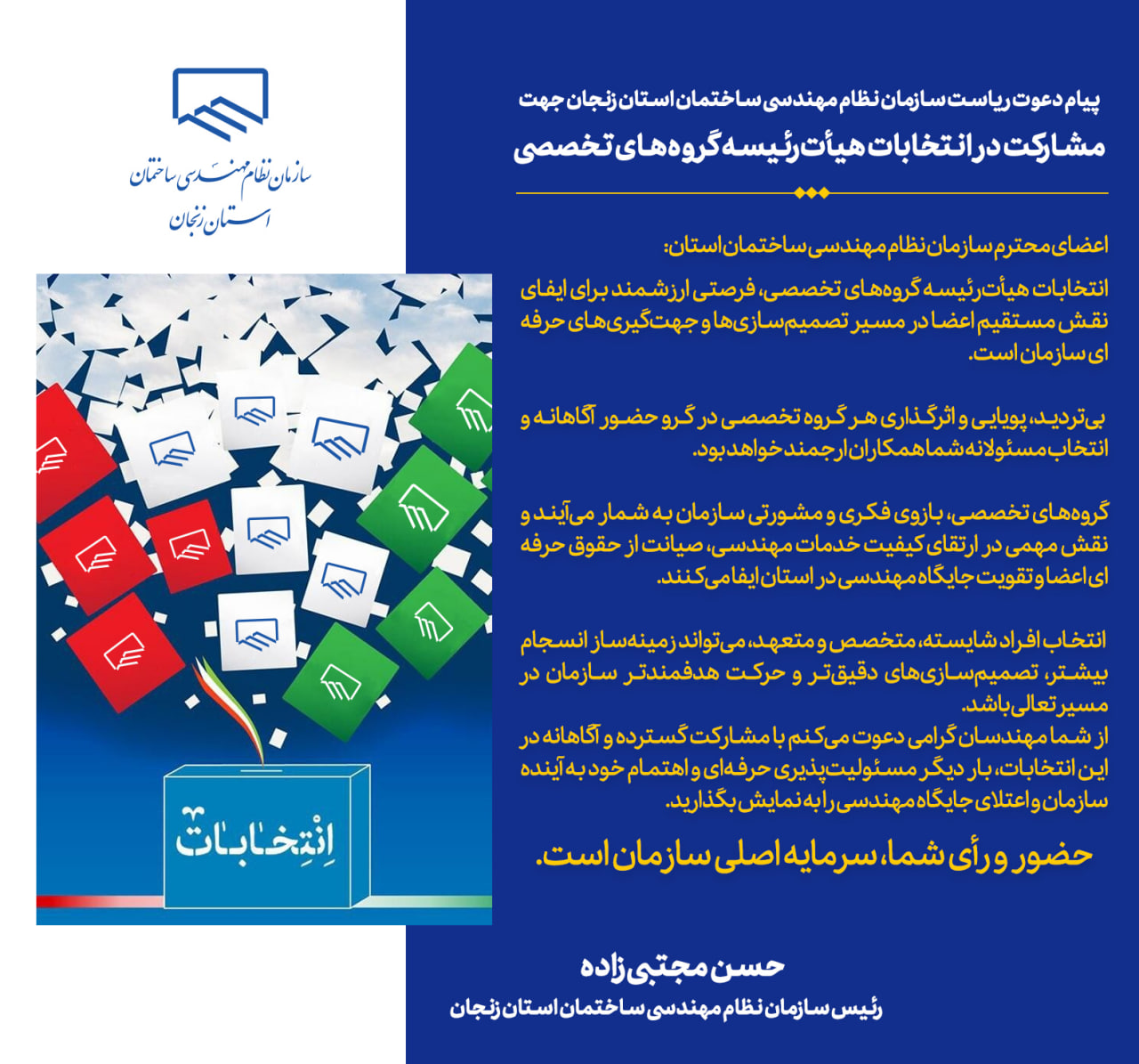 🔷️🔹️مهندس حسن مجتبیزاده، رئیس سازمان نظام مهندسی ساختمان استان زنجان، با صدور پیامی، اعضای سازمان را به مشارکت فعال، آگاهانه و مسئولانه در انتخابات هیأترئیسه گروههای تخصصی دعوت کرد و حضور و رأی اعضا را سرمایه اصلی سازمان در مسیر تصمیمسازیهای حرفهای و ارتقای جایگاه مهندسی استان دانست.