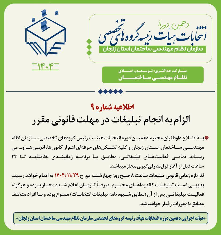 🔹 🔷به اطلاع داوطلبان محترم دهمین دوره انتخابات هیئت رئیس گروههای تخصصی سازمان نظام مهندسی ساختمان استان زنجان و کلیه تشکلهای حرفهای اعم از کانونها، انجمنها و... میرساند تمامی فعالیتهای تبلیغاتی، مطابق با برنامه زمانبندی نظامنامه تا ۲۴ساعت قبل از آغاز فرایند رایگیری مجاز میباشد.