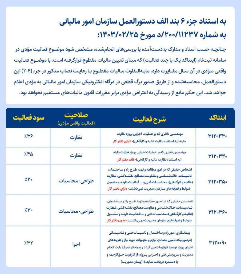 🔵ضریب اینتاکد مهندسین در بخشنامه مالیات مقطوع تبصره ماده (۱۰۰) قانون مالیات‌های مستقیم