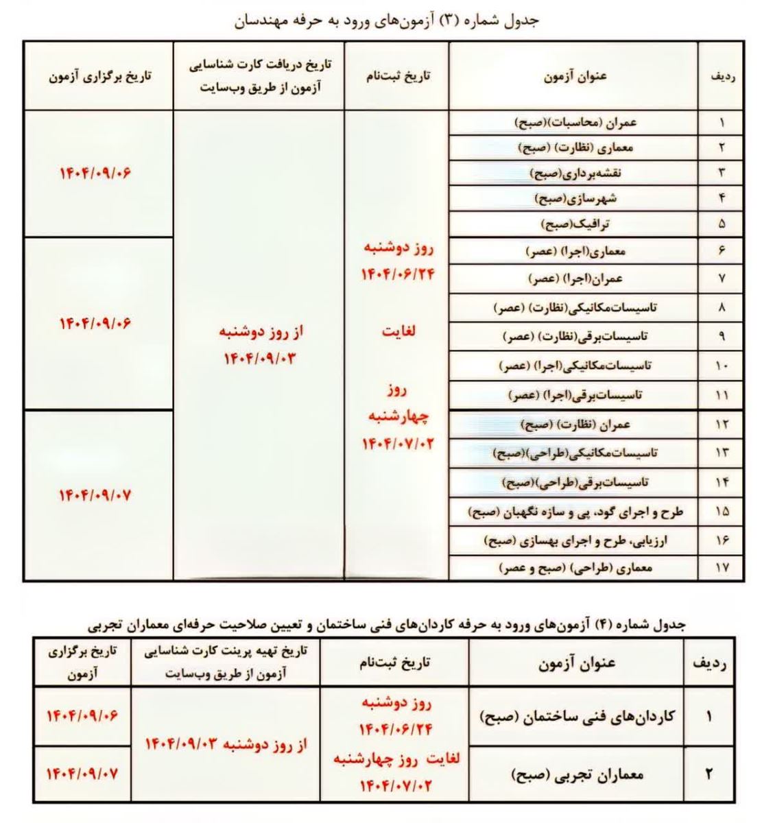 ⬅️آغاز ثبتنام آزمونهای ورود به حرفه نظام مهندسی آذرماه ۱۴۰۴ 📝ثبتنام: از ۲۴ شهریورماه تا ۲ مهرماه ۱۴۰۴