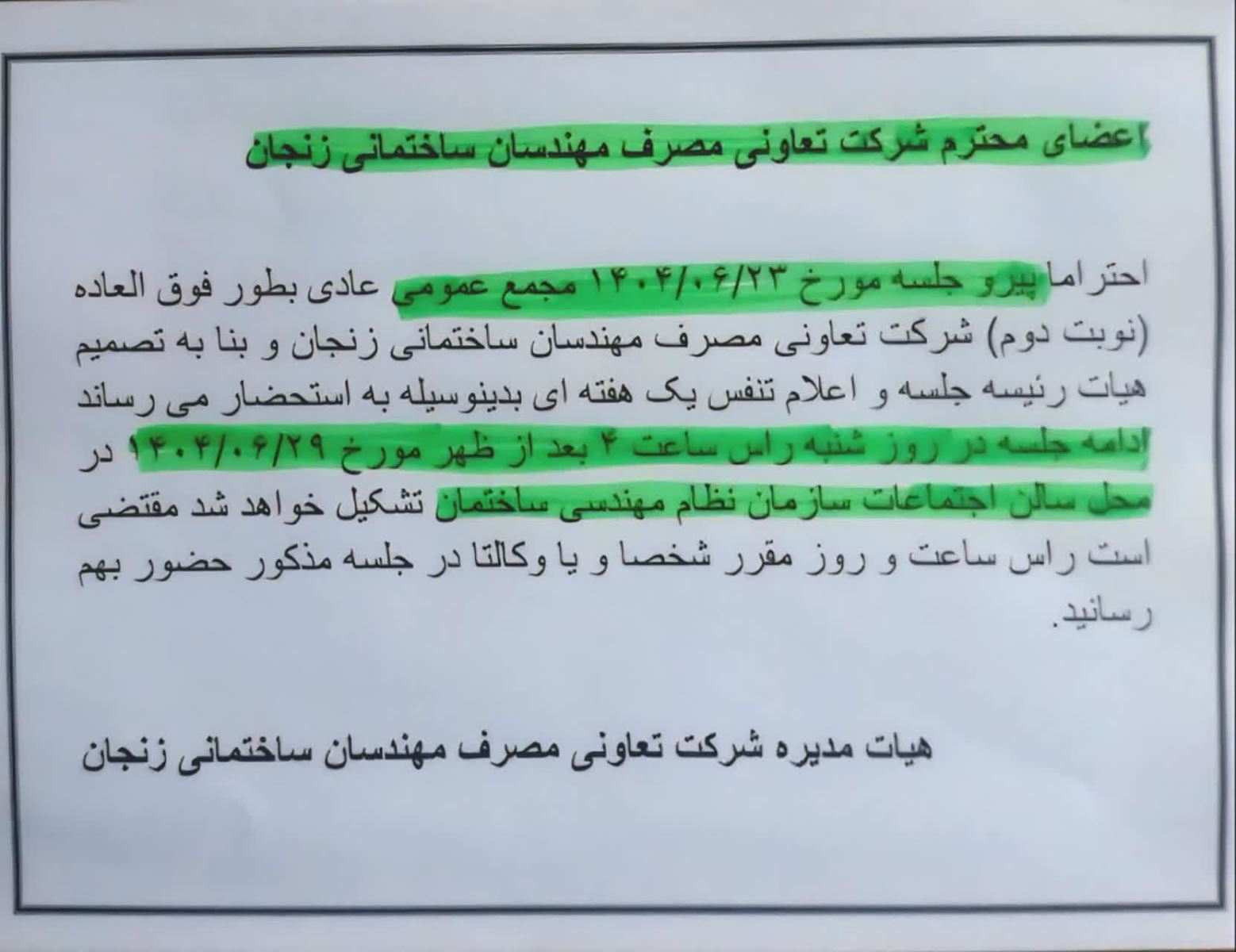 آگهی دعوت به ادامه مجمع عمومی عادی نوبت دوم شرکت تعاونی مصرف مهندسان ساختمانی زنجان (جلسه بعد از تنفس)