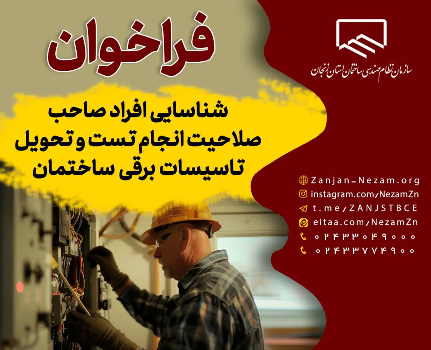 ✴️فراخوان شناسایی افراد دارای صلاحیت انجام تست و تحویل تاسیسات برقی ساختمان ☀️سازمان نظام مهندسی ساختمان استان زنجان در راستای اجرای الزامات مقررات ملی ساختمان، قصد دارد نسبت به عملیاتی نمودن انجام تست و تحلیل تاسیسات برقی ساختمان اقدام نماید.