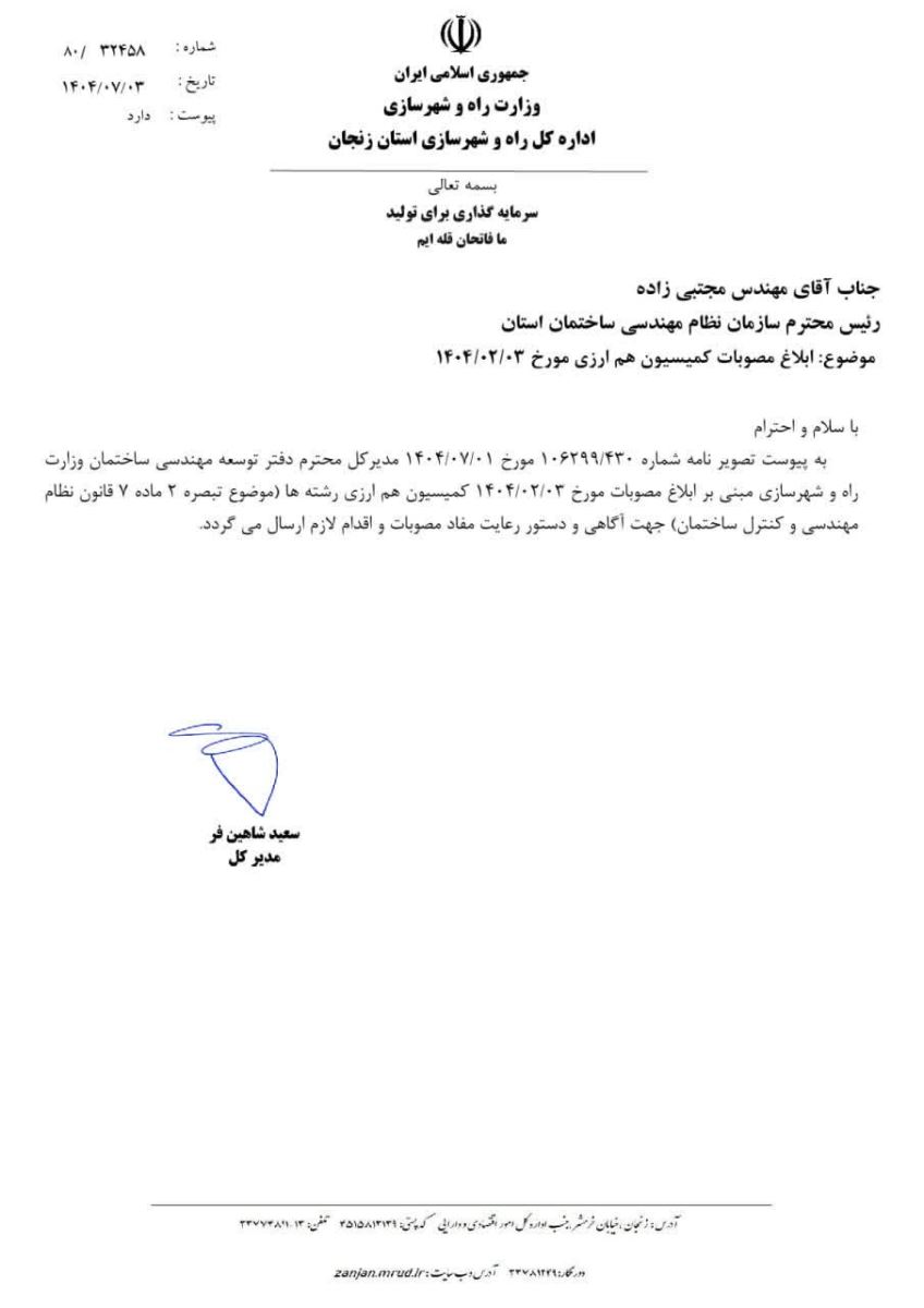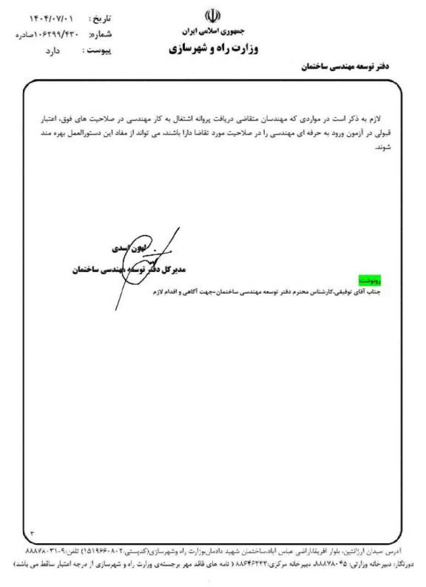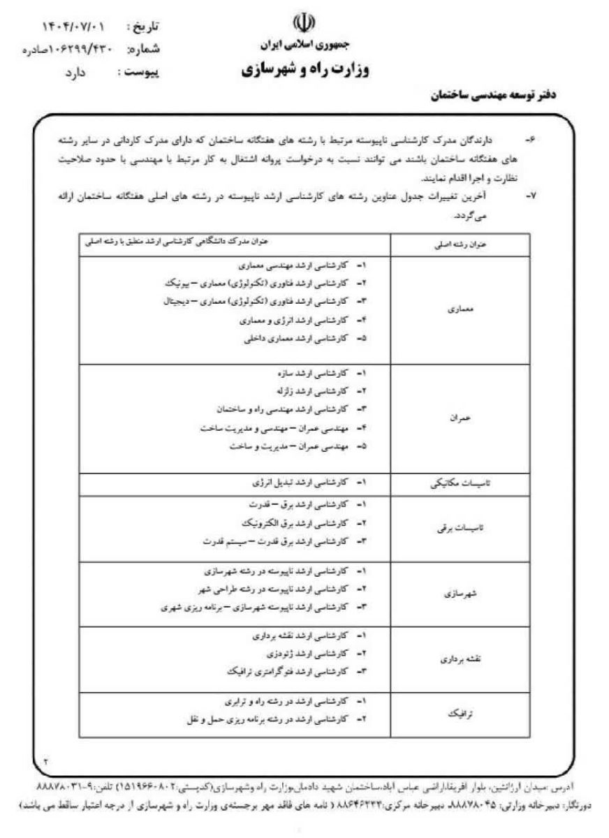 🔹️مدیرکل دفتر توسعه مهندسی ساختمان وزارت راه و شهرسازی مصوبات مورخ ۱۴۰۴/۰۷/۰۱ کمیسیون هم ارزی رشتهها (موضوع تبصره ۲ ماده ۷ قانون نظام مهندسی و کنترل ساختمان) را ابلاغ کرد.