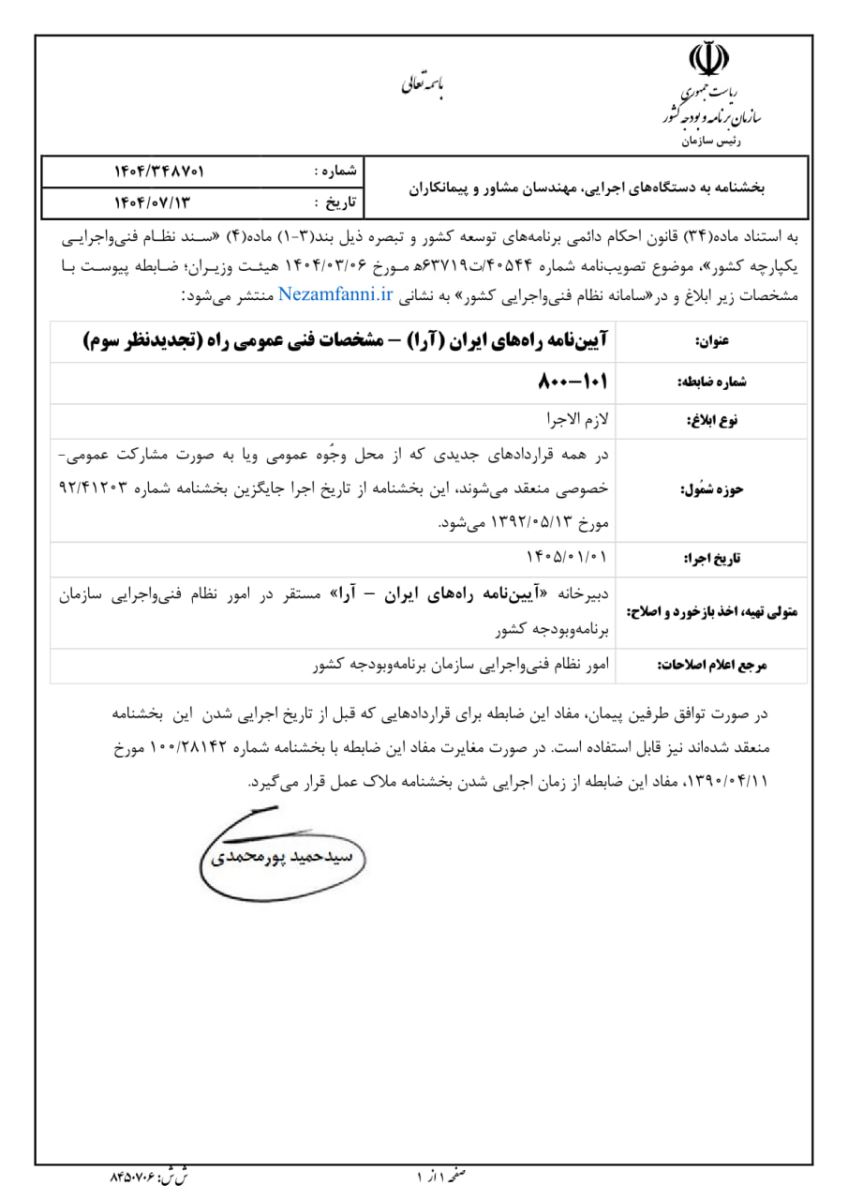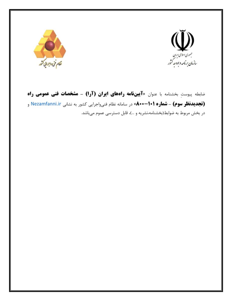 ♨️ضابطه پیوست بخشنامه با عنوان آیین نامه راه های ایران (آرا) _مشخصات فنی عمومی راه، به شماره ۱۰۱_۸۰۰ در سامانه نظام فنی و اجرایی کشور به نشانی Nezamfanni.ir و در بخش مربوط به ضوابط (بخشنامه، نشریه و...) قابل دسترسی عموم میباشد.