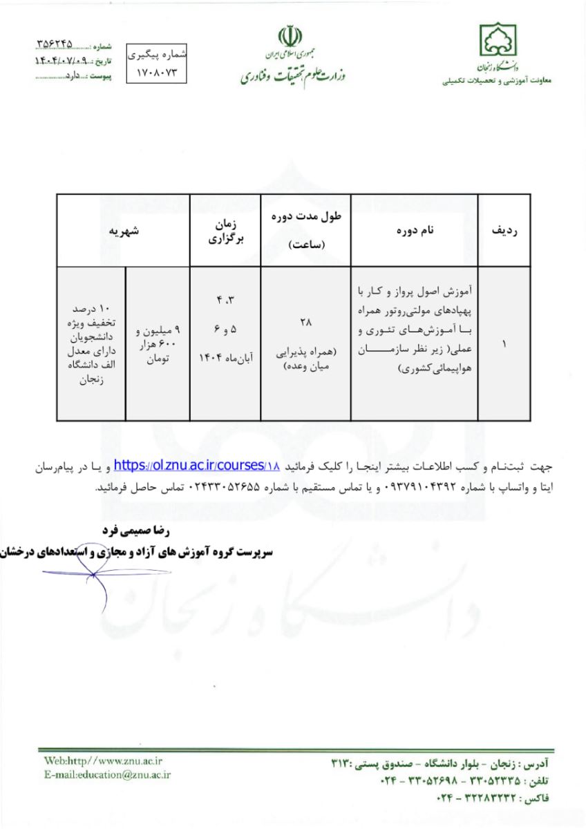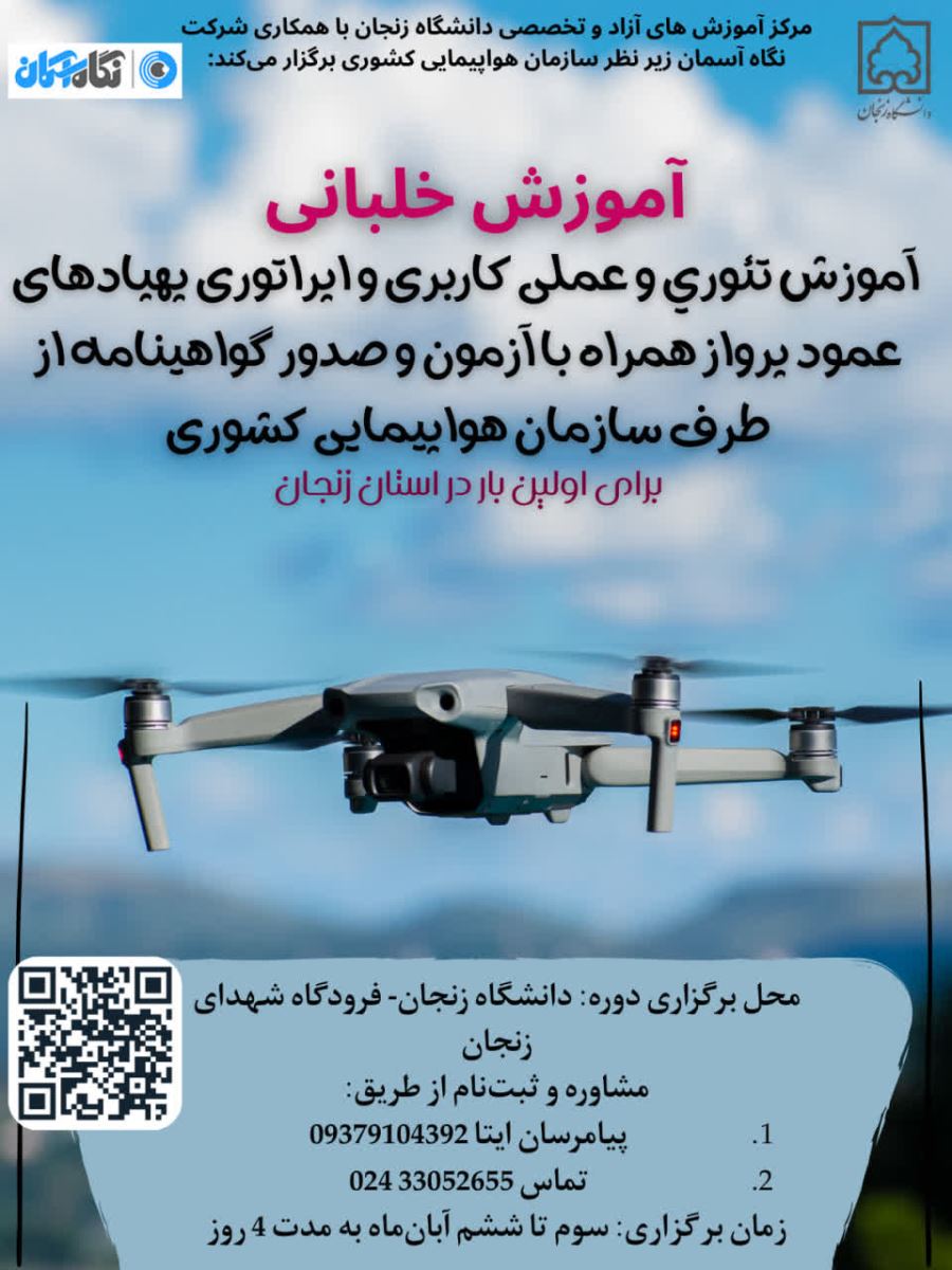 🔰 مرکز آموزشهای آزاد و تخصصی دانشگاه زنجان با همکاری شرکت نگاه آسمان زیر نظر سازمان هواپیمایی کشوری برگزار میکند: