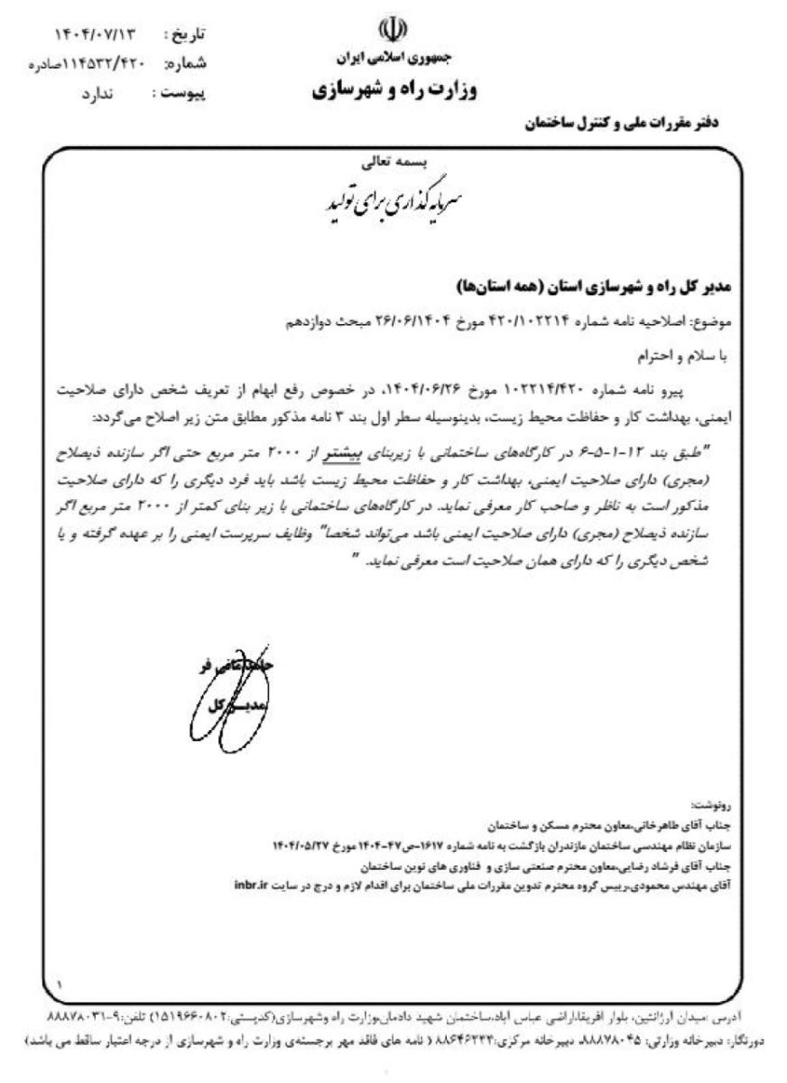 🔶️ اصلاح سطر اول بند 3 نامه شماره 420/102214 وزارت در خصوص مبحث 12 مقررات ملی ساختمان 🔸️سطر اول بند ۳ نامه دفتر مقررات ملی و کنترل ساختمان وزارت راه و شهرسازی با مضمون رفع ابهام از تعریف شخص دارای صلاحیت ایمنی بند ۱۲_۱_۵_۶ مبحث ۱۲ اصلاح گردید.