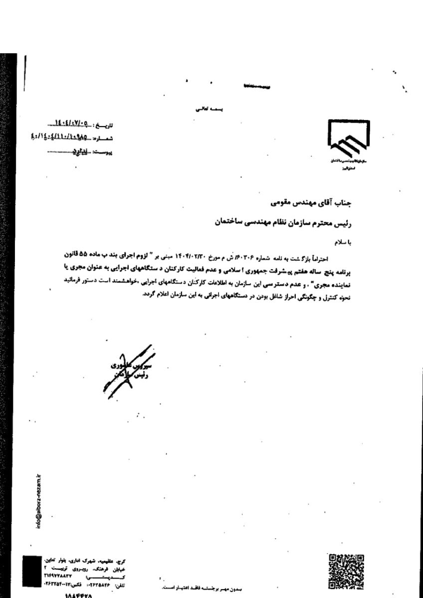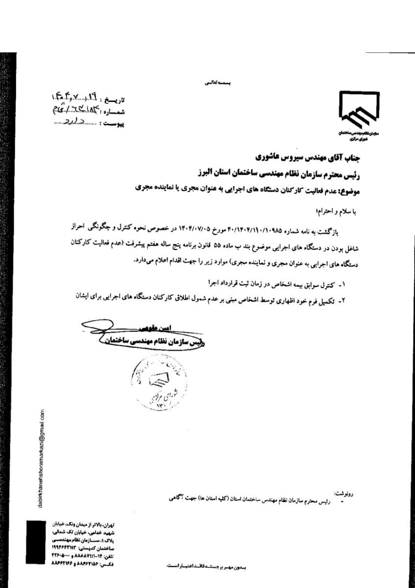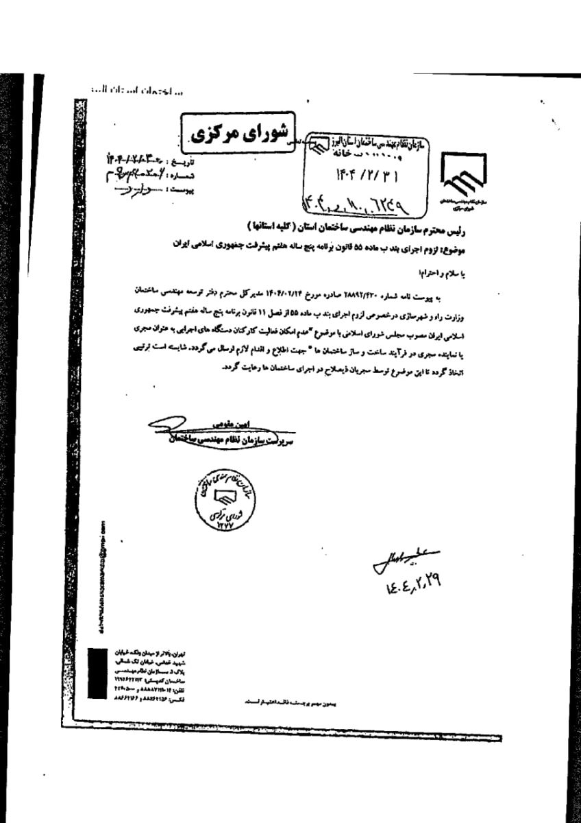 🔶️عدم امکان فعالیت کارکنان دستگاه های اجرایی به عنوان مجری یا نماینده مجری 🔸️ به اطلاع مجریان محترم ذیصلاح میرساند با عنایت به لزوم اجرای بند ب ماده ۵۵ قانون برنامه ۵ ساله هفتم پیشرفت جمهوری اسلامی و عدم عالیت کارکنان دستگاههای اجرایی به عنوان مجری یا نماینده مجری، جهت نحوه کنترل و چگونگی احراز شاغل بودن در دستگاههای اجرایی موارد ذیل توسط سازمان استان صورت خواهد پذیرفت: