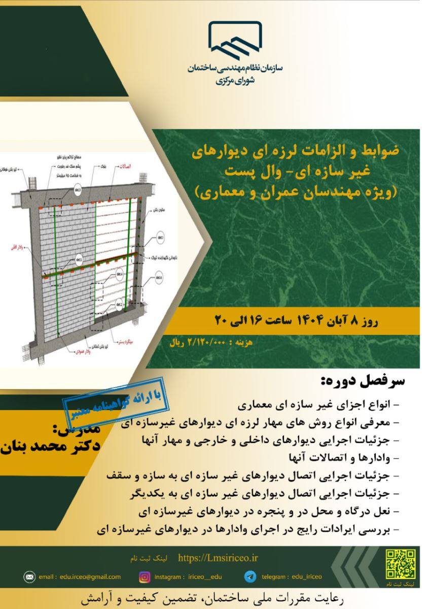 ⚜️قابل توجه اعضای محترم سازمان در رشتههای عمران و معماری ☀️دوره آموزشی " ضوابط و الزامات لرزهای دیوارهای غیر سازهای _ وال پست " 🔆زمان برگزاری: روز ۸ آبان سال ۱۴۰۴ از ساعت ۱۶:۰۰ الی ۲۰:۰۰ 🔅مکان برگزاری: به صورت مجازی