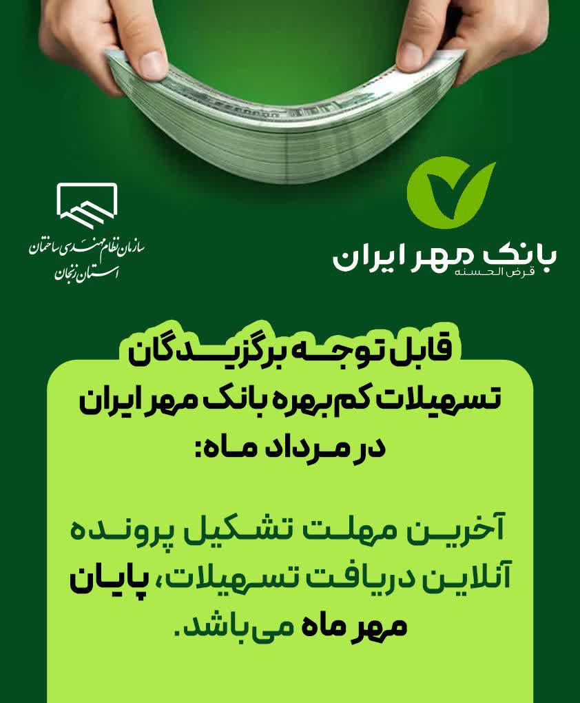 ✳️به اطلاع مهندسان محترمی که در دومین قرعهکشی (مردادماه) طرح تسهیلات کمبهره سازمان در بانک مهر ایران برگزیده شدهاند میرساند: