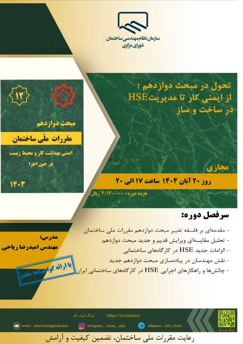 ⚜️قابل توجه اعضای محترم سازمان ☀️دوره آموزشی " تحول در مبحث دوازدهم؛ از ایمنی کار تا مدیریت HSE در ساخت و ساز " 🔆زمان برگزاری: روز ۲۰ آبان سال ۱۴۰۴ از ساعت ۱۷:۰۰ الی ۲۰:۰۰ 🔅مکان برگزاری: به صورت مجازی