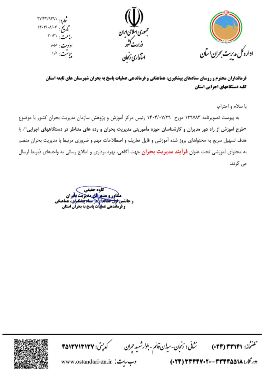 🔰طرح آموزش مدیران و کارشناسان حوزه مأموریتی مدیریت بحران و ردههای متناظر در دستگاههای اجرایی