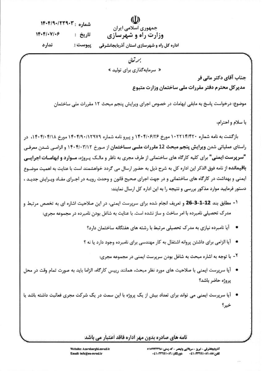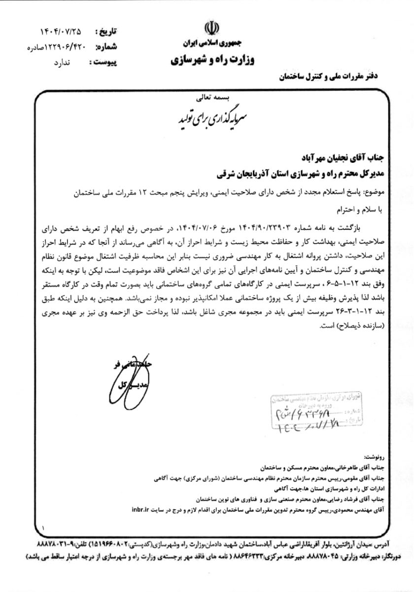 💢رفع ابهام از تعریف شخص داری صلاحیت ایمنی ویرایش پنجم مبحث ۱۲ مقررات ملی ساختمان ♨️نامه مدیر کل محترم دفتر مقررات ملی و کنترل ساختمان وزارت راه و شهرسازی (با کلیه ضمائم) در خصوص رفع ابهام از تعریف شخص دارای صلاحیت ایمنی ویرایش پنجم مبحث ۱۲ مقررات ملی ساختمان