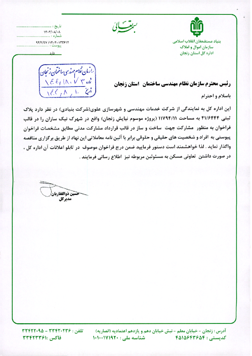 ⬅️پروژه نیایش زنجان (پلاک ثبتی ۱۱۷۹۴/۱۱)