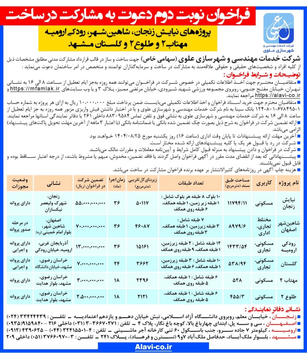 ↕️دعوت به مشارکت در ساخت پروژههای نیایش زنجان شاهین شهر رودکی ارومیه مهتاب ۲ و طلوع ۲ و گلستان مشهد