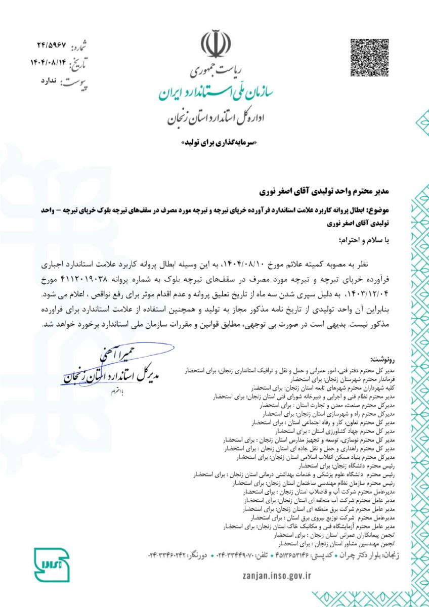 🛡 ابطال پروانه کاربرد علامت استاندارد فرآورده خرپای تیرچه و تیرچه مورد مصرف در سقفهای تیرچه بلوک خرپای تیرچه - واحد تولیدی آقای اصغر نوری