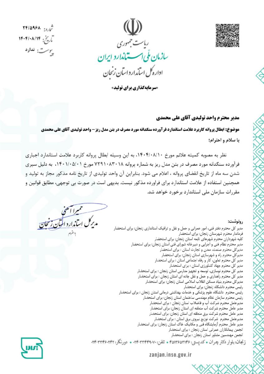🛡 ابطال پروانه کاربرد علامت استاندارد فرآورده سنگدانه مورد مصرف در بتن مدل ریز - واحد تولیدی آقای علی محمدی