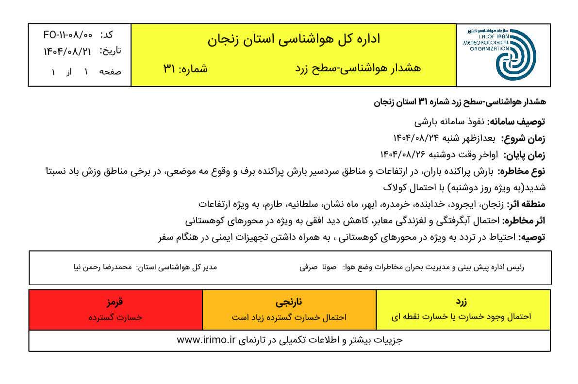 ⚠️ هشدار هواشناسی سطح زرد ( احتمال وجود خسارت یا خسارت نقطهای) ⏰ از روز شنبه بیست و چهارم آبان ماه الی اواخر وقت دوشنبه بیست و ششم آبان ماه