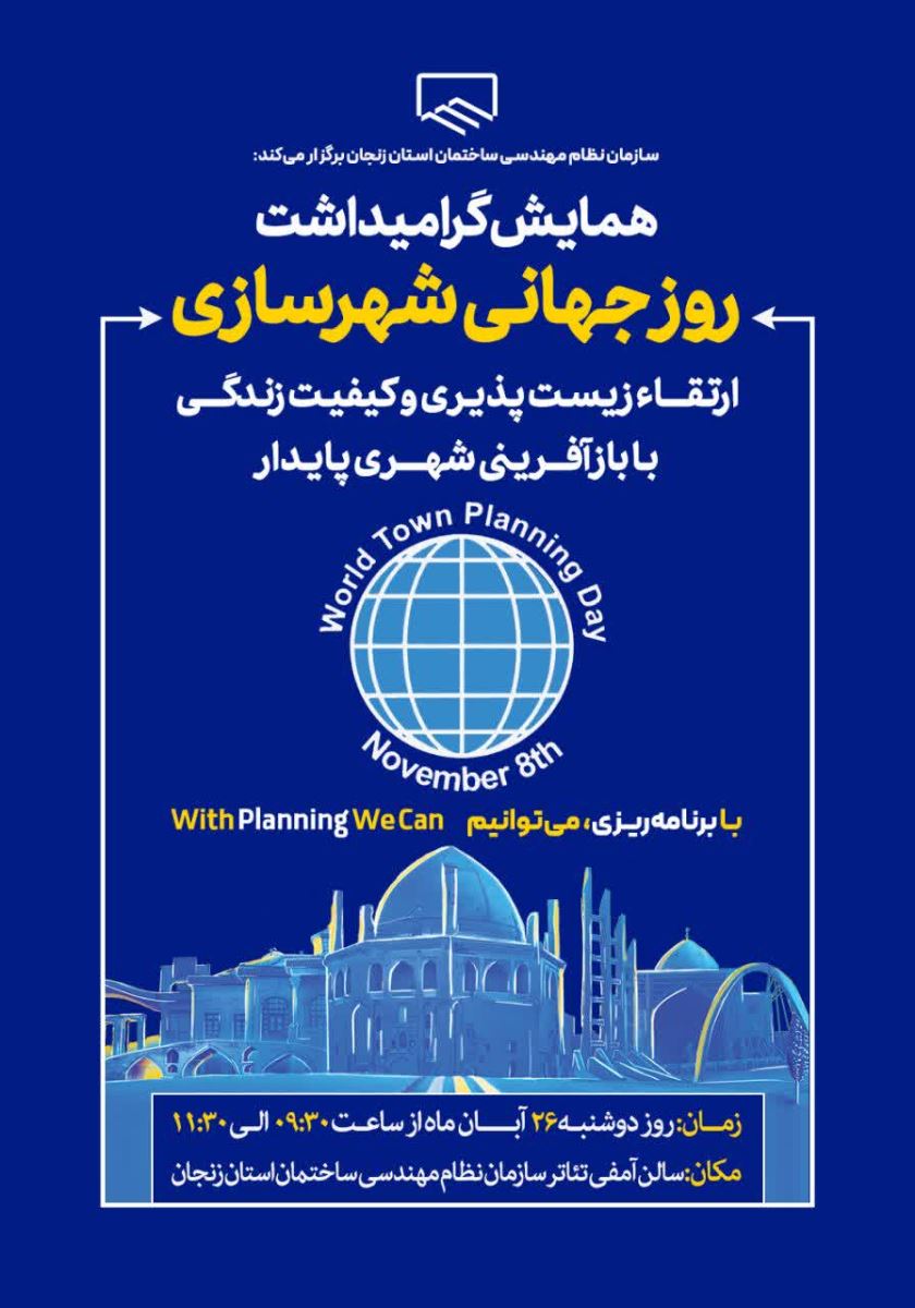 🔷️همایش گرامیداشت روز جهانی شهرسازی با موضوع: 💠ارتقاء زیست پذیری و کیفیت زندگی، با بازآفرینی شهری پایدار 🔹️زمان: روز دوشنبه ۲۶ آبان ماه از ساعت ۰۹:۳۰ الی ۱۱:۳۰ 🔹️مکان: سالن آمفی تئاتر سازمان نظام مهندسی ساختمان استان زنجان