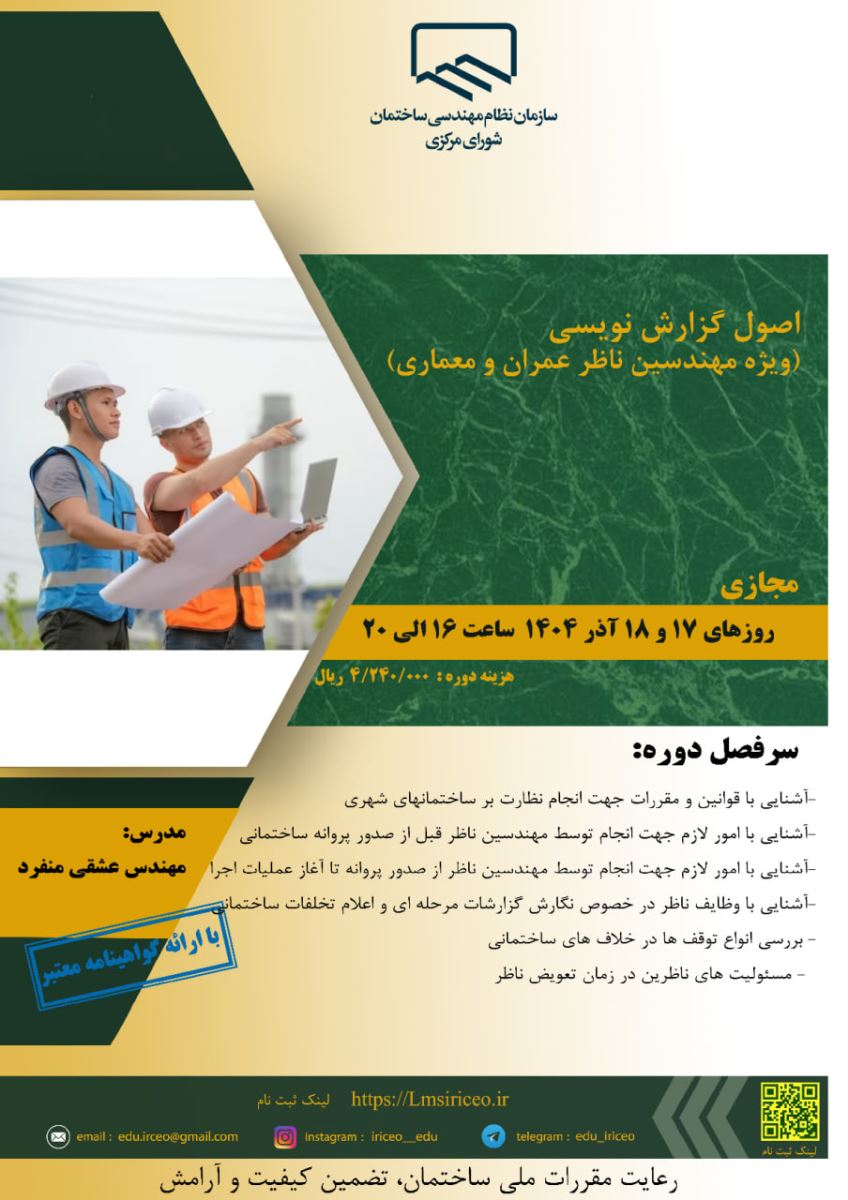 ⚜️قابل توجه اعضای محترم رشتههای عمران و معماری سازمان ☀️ دوره آموزشی " اصول گزارش نویسی " 🔆زمان برگزاری: روزهای ۱۷ و ۱۸ آذر ماه ۱۴۰۴ از ساعت ۱۶:۰۰ الی ۲۰:۰۰ 🔅مکان برگزاری: به صورت مجازی