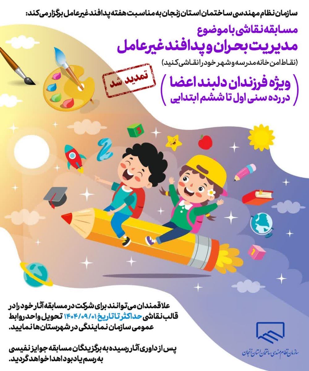 🎨 تمدید زمان مسابقه نقاشی به مناسبت هفته پدافند غیرعامل نظر به استقبال اعضای محترم سازمان و درخواستهای واصله، زمان شرکت در مسابقه نقاشی "نقاط امن" تا اول آذر ماه تمدید شد