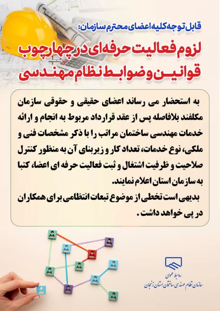 ⚡️قابل توجه کلیه اعضای محترم سازمان: ✴️لزوم فعالیت حرفهای در چهارچوب قوانین و ضوابط نظام مهندسی