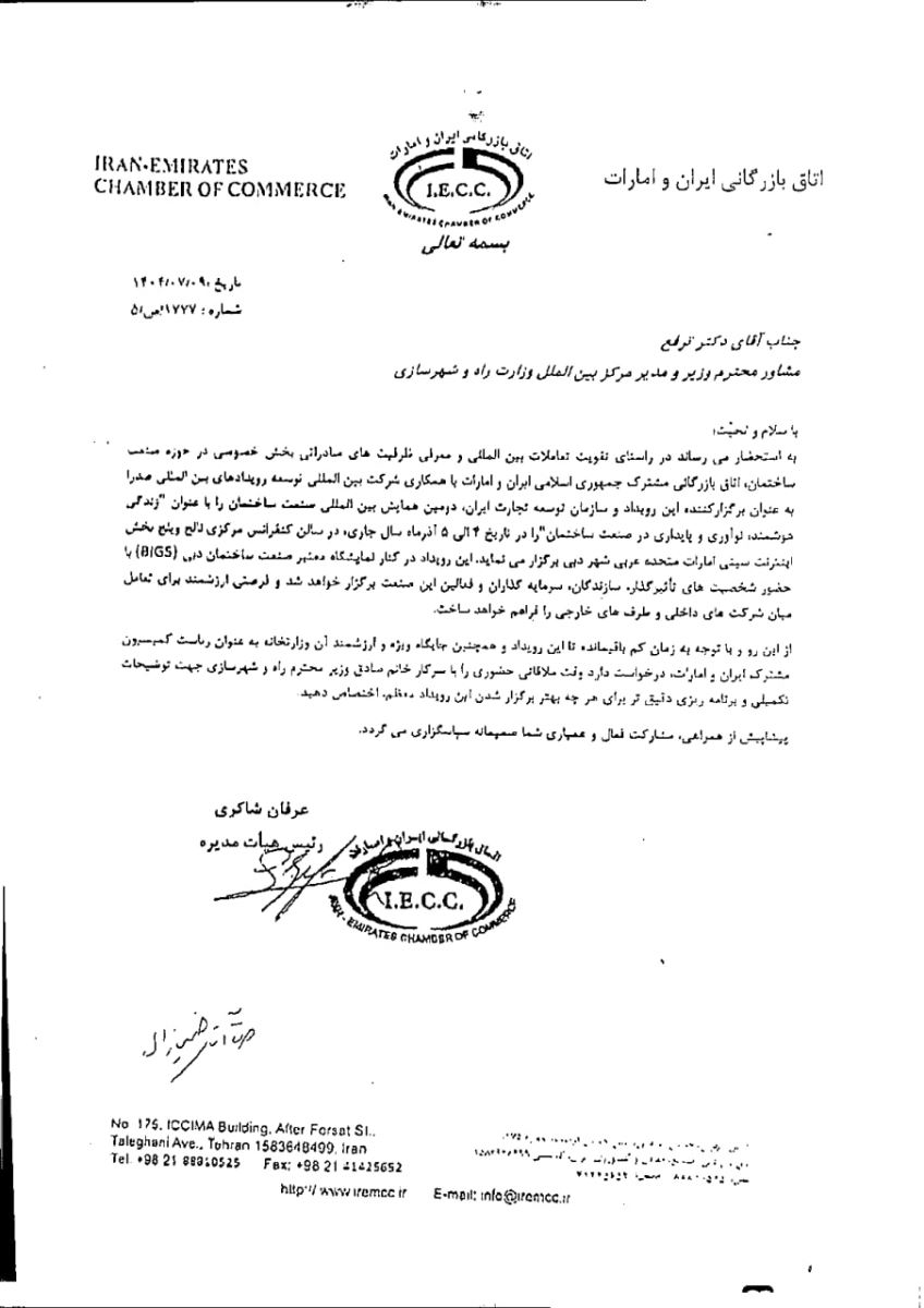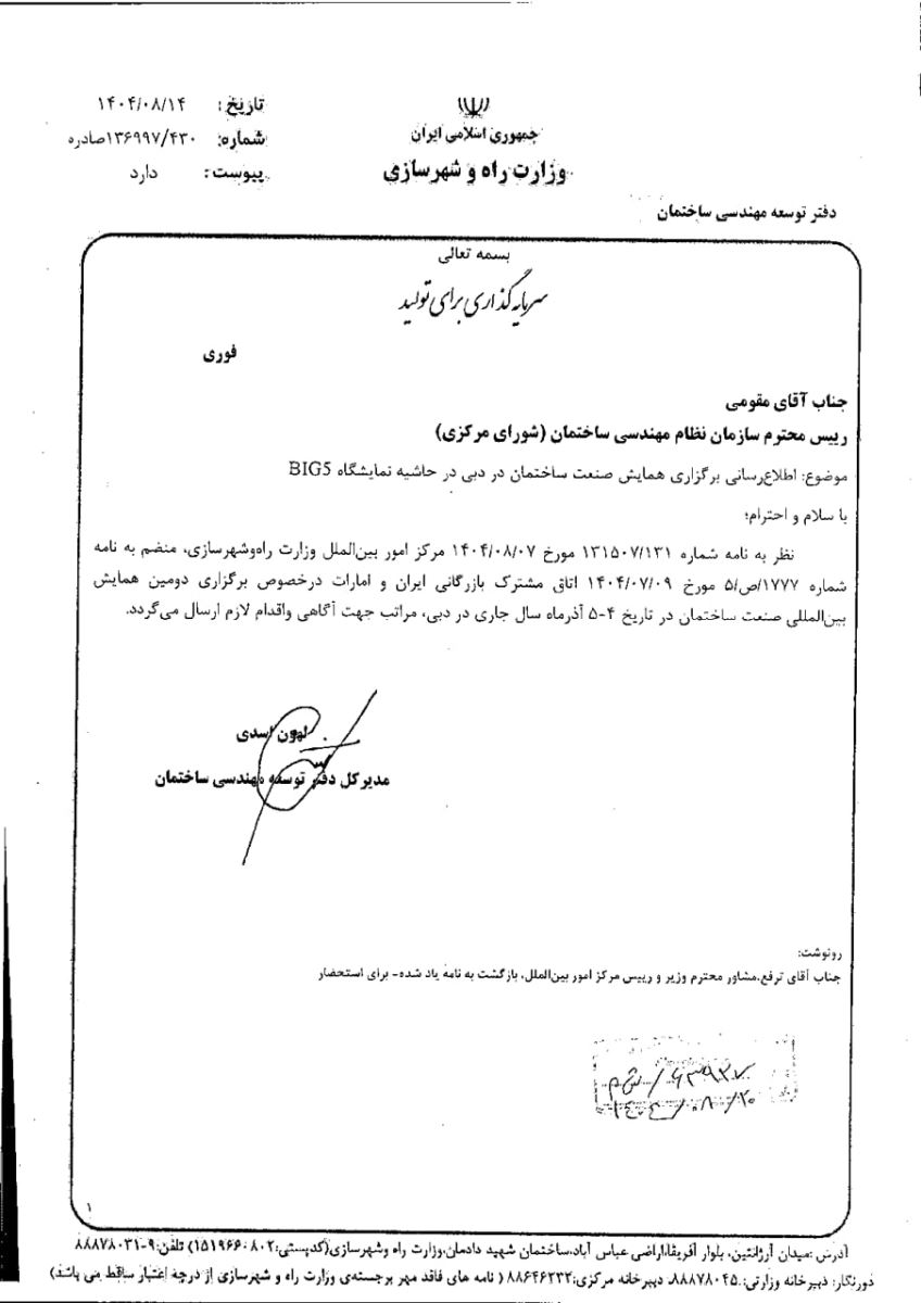 🔹️مکاتبه رییس شورای مرکزی پیرو مکاتبه مدیر کل دفتر توسعه مهندسی ساختمان در خصوص برگزاری نمایشگاه صنعت ساختمان در دبی در حاشیه نمایشگاه BIG5