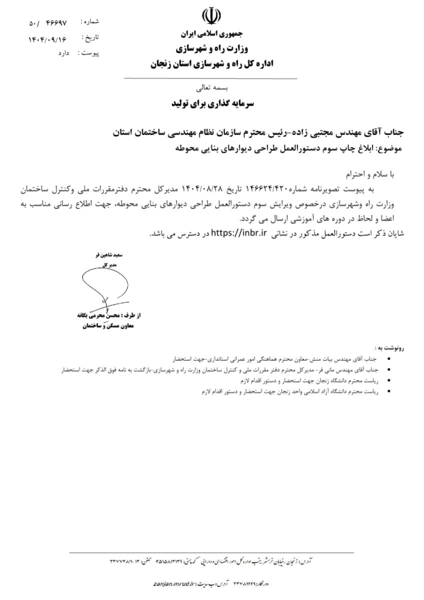 🔹️به اطلاع اعضای محترم سازمان و فعالان صنعت ساختمان می‌رساند با توجه به ابلاغیه دفتر مقررات ملی و کنترل ساختمان در خصوص دستورالعمل طراحی و اجرای دیوارهای بنایی محوطه، ویرایش سوم ضوابط مذکور تهیه و رعایت مفاد این ویرایش برای ساختمان‌هایی که دستور تهیه نقشه آنها یکماه پس از تاریخ این ابلاغ به بعد صادر می‌شود الزامی است و آز آن تاریخ به بعد ویرایش پیشین فاقد اعتبار خواهد بود.