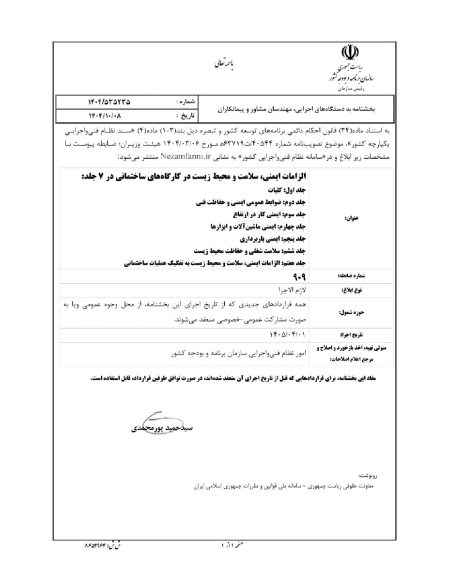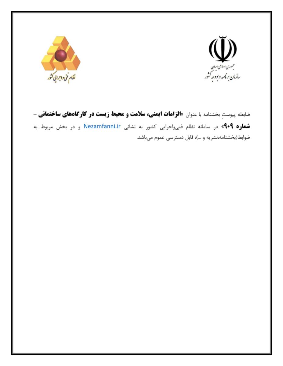 ⬅️ضابطه پیوست بخشنامه به عنوان "الزامات ایمنی - سلامت و محیط زیست در کارگاههای ساختمانی" در 7 جلد با شماره ۹۰۹ در سامانه نظام فنی و اجرایی کشور به نشانی www.Nezamfanni.ir و در بخش مربوط به ضوابط (بخشنامه، نشریه و ...)قابل دسترسی عموم میباشد.