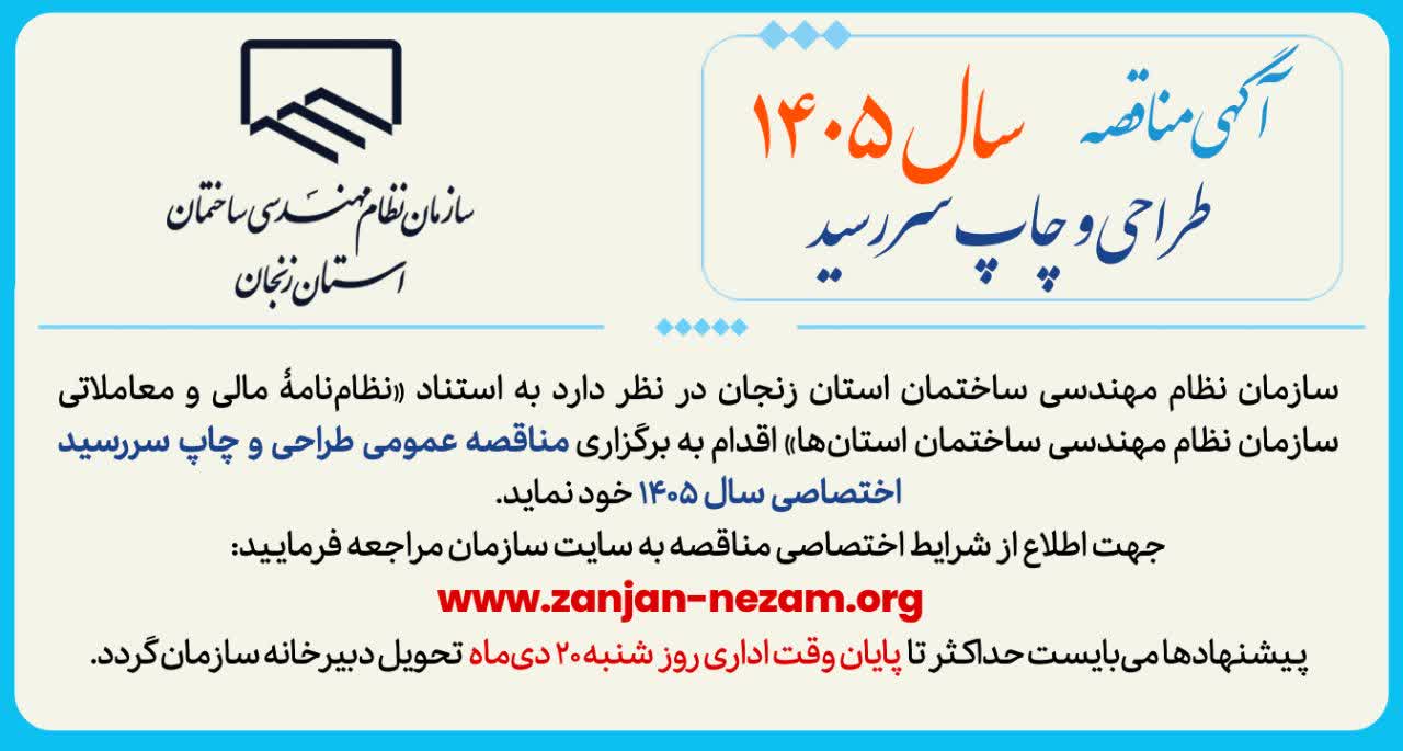 تمدید آگهی مناقصه طراحی و چاپ سررسید اختصاصی سال ۱۴۰۵ سازمان نظام مهندسی ساختمان استان زنجان