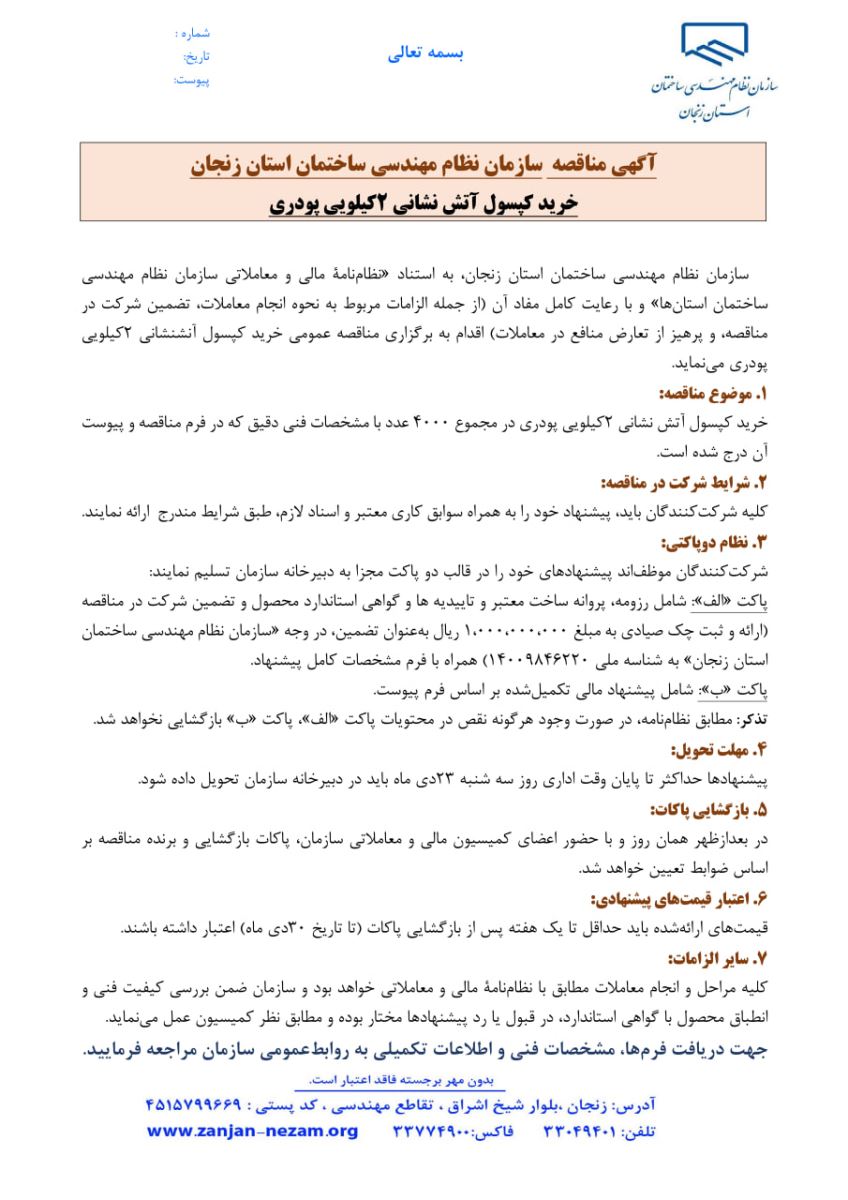 ☀️سازمان نظام مهندسی ساختمان استان زنجان، به استناد «نظامنامۀ مالی و معاملاتی سازمان نظام مهندسی ساختمان استانها» و با رعایت کامل مفاد آن (از جمله الزامات مربوط به نحوه انجام معاملات، تضمین شرکت در مناقصه، و پرهیز از تعارض منافع در معاملات) اقدام به برگزاری مناقصه عمومی خرید کپسول آتش نشانی ۲ کیلویی پودری مینماید.