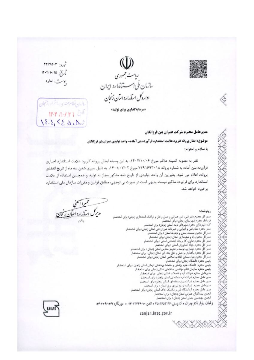 🛡 ابطال پروانه کاربرد علامت استاندارد فرآورده بتن آماده -  واحد تولیدی عمران بتن فرزانگان