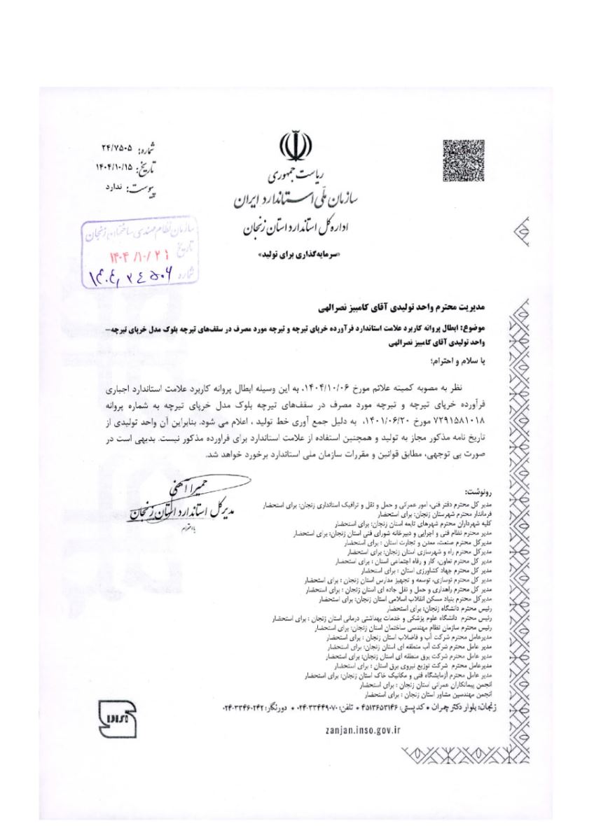 🛡 ابطال پروانه کاربرد علامت استاندارد فرآورده خرپای تیرچه و تیرچه مورد مصرف در سفقف‌های تیرچه بلوک مدل خرپای تیرچه بتن  _ واحد تولیدی آقای کامبیز نصرالهی