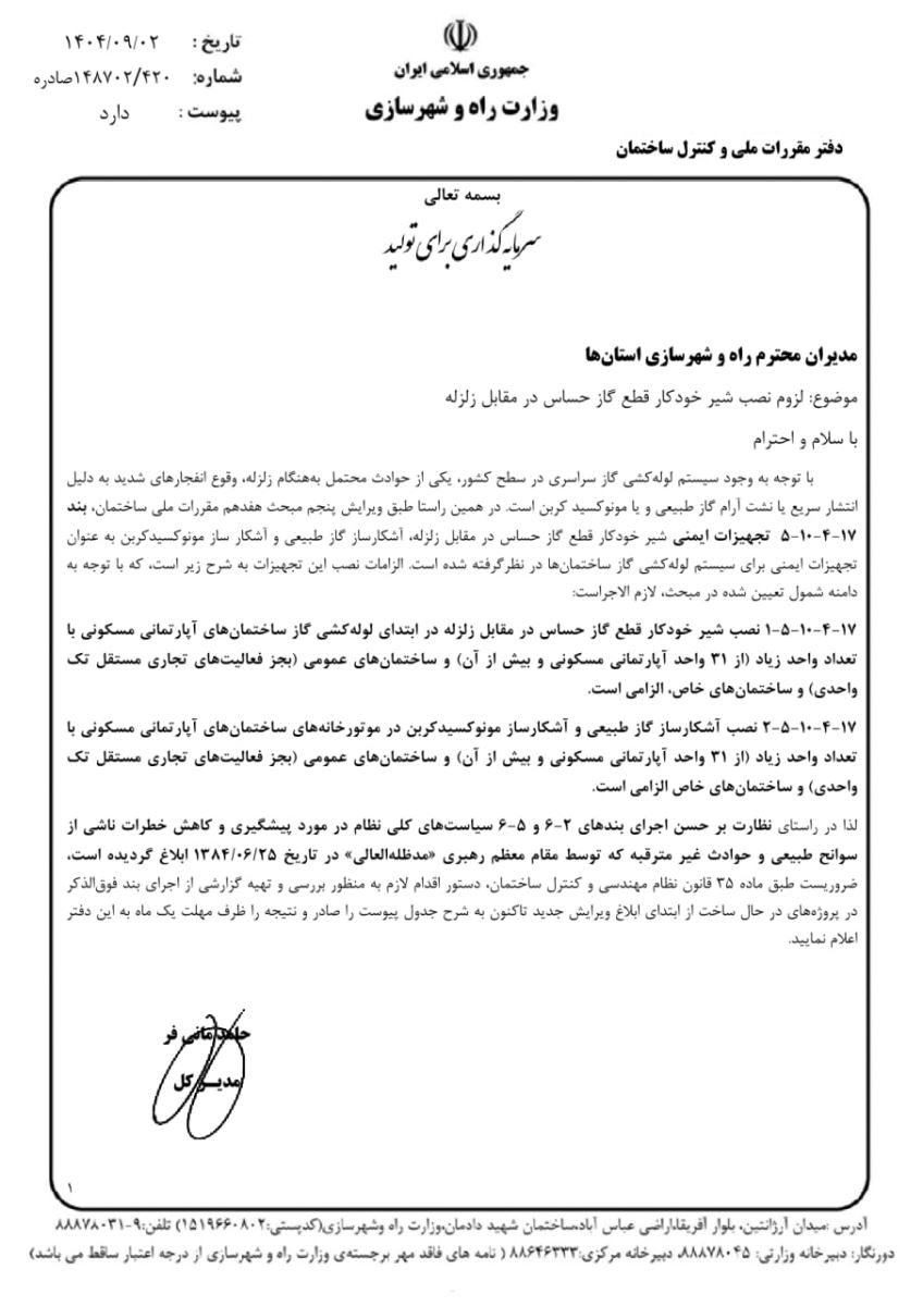 ✅️تاکید مدیرکل دفتر مقررات ملی و کنترل ساختمان مزارت راه وشهرسازی بر الزام نصب تجهیزات ایمنی لوله کشی گاز ساختمان ها (شیر خودکار قطع گاز حساس در مقابل زلزله، آشکارساز طبیعی و مونو اکسید کربن در موتورخانه) طبق مفاد ویرایش پنجم مبحث ۱۷مقررات ملی ساختمان _ (بند ۵_۱۰_۴_۱۷)