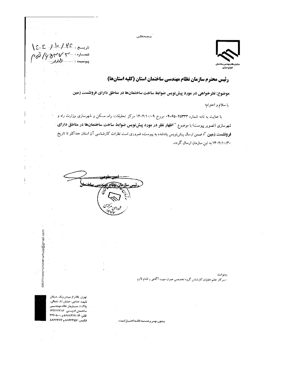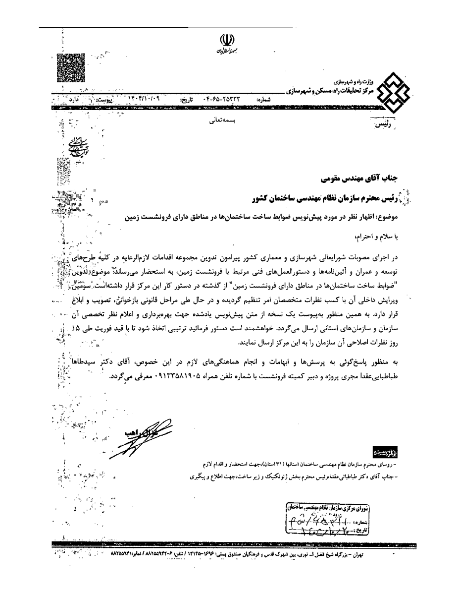 ⭕️نظرخواهی در مورد پیشنویس ضوابط ساخت ساختمانها در مناطق دارای فرونشت زمین 💢مکاتبه مرکز تحقیقات راه،مسکن و شهرسازی وزارت راه و شهرسازی با موضوع اظهارنظر در مورد پیشنویس ضوابط ساخت ساختمانها در مناطق دارای فرونشت زمین