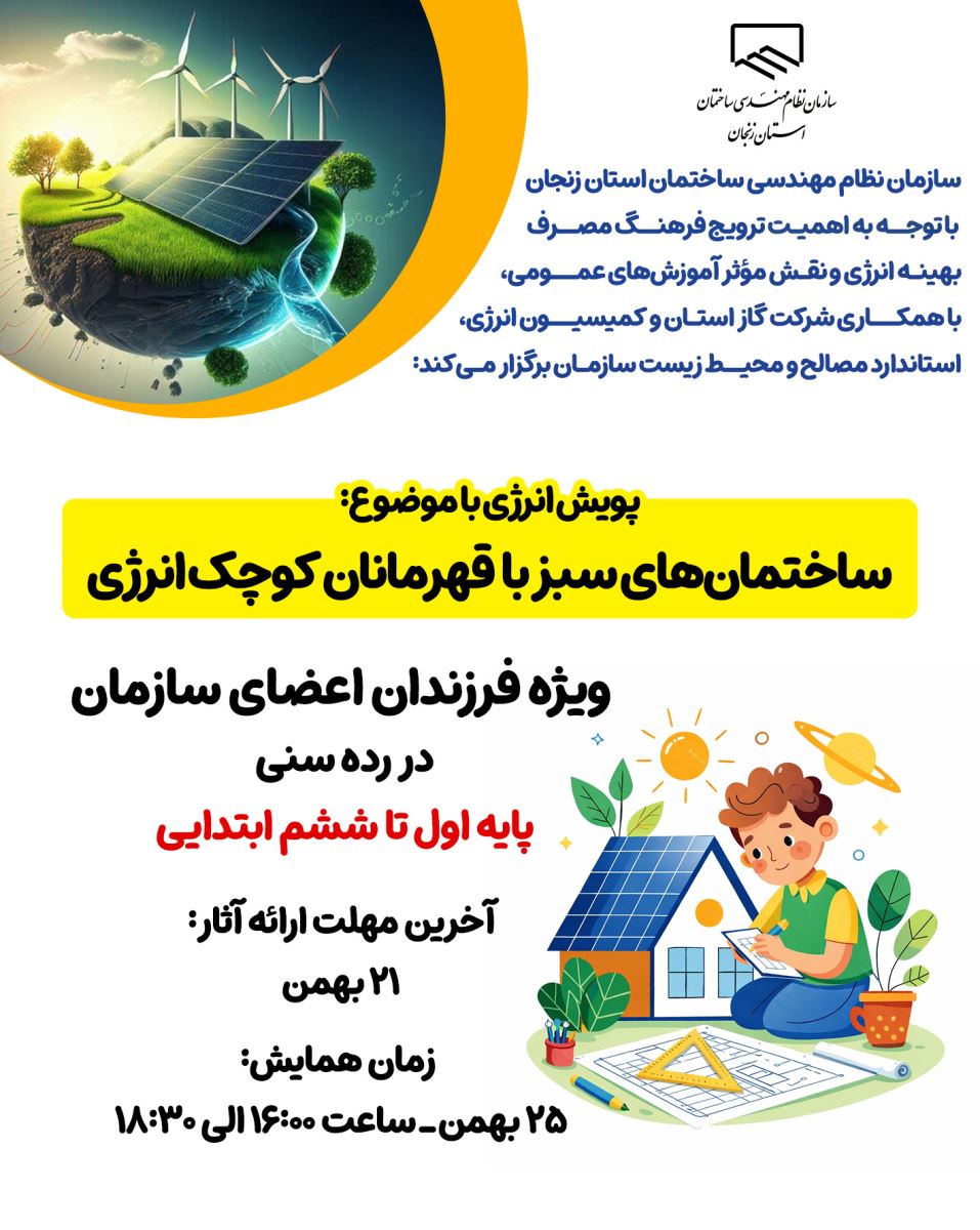 سازمان نظام مهندسی ساختمان استان زنجان، با توجه به اهمیت ترویج فرهنگ مصرف بهینه انرژی و نقش مؤثر آموزش‌های عمومی، با همکاری شرکت گاز استان و کمیسیون انرژی، استاندارد مصالح و محیط زیست سازمان برگزار می‌کند: