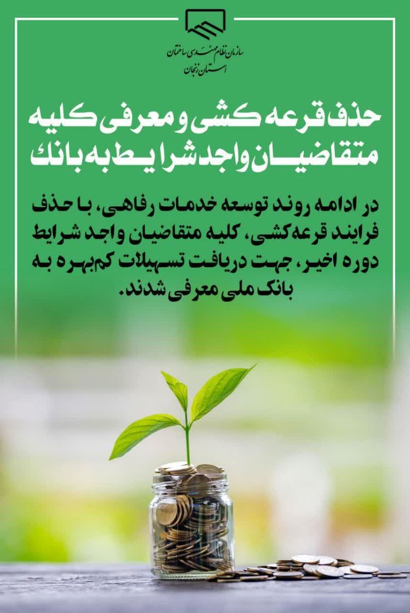 ✳️ مهندس حسن مجتبی‌زاده، رئیس سازمان نظام مهندسی ساختمان استان زنجان با تأکید بر رویکرد رفاه‌محور هیأت‌مدیره اظهار داشت: با برنامه‌ریزی دقیق، تأمین به‌موقع منابع و افزایش ظرفیت پرداخت، موفق شدیم همانند ماه گذشته تمامی متقاضیان واجد شرایط را بدون انجام قرعه‌کشی جهت تعویض تسهیلات به بانک عامل (ملی) معرفی کنیم. این روند نشان‌دهنده پایداری و جدیت سازمان در ارائه خدمات رفاهی مؤثر و قابل اتکاست.