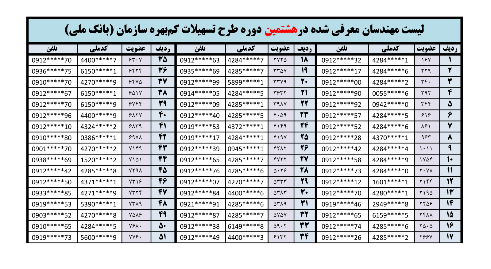 لیست مهندسان معرفی شده در هشتمین دوره طرح طرح تسهیلات کم‌بهره سازمان نظام مهندسی ساختمان زنجان به بانک ملی