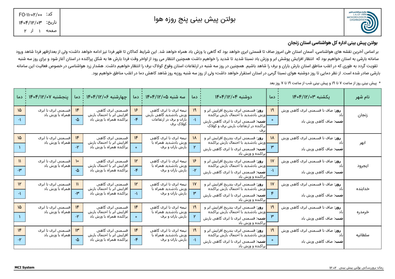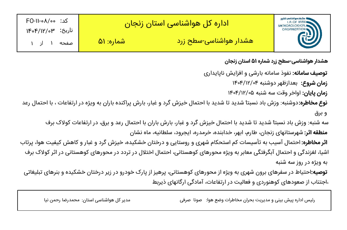 ⚠️ هشدار هواشناسی سطح زرد ( احتمال وجود خسارت یا خسارت نقطهای) ⏰ از روز دوشنبه ۴ اسفند ماه الی اواخر وقت سهشنبه ۵ اسفند ماه سال ۱۴۰۴